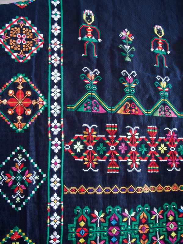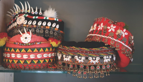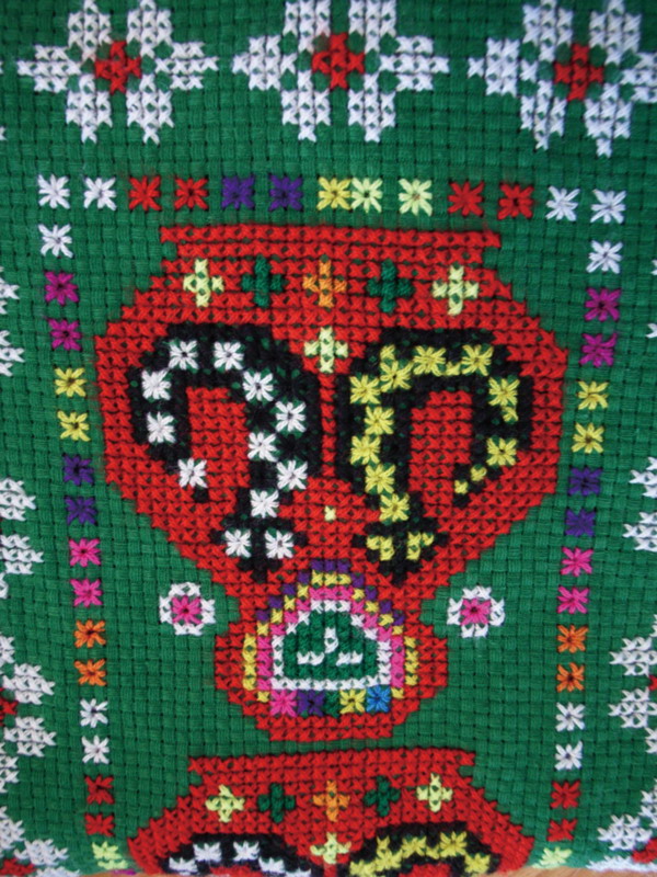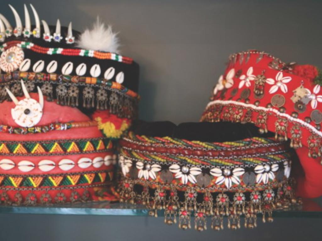 排灣族有一個嚴格的階級制度,大致上分為頭目(mamazangilan)、貴族、勇士、平民四個階級,每個階級各有專屬的器物圖騰與紋樣作為表徵。其中,青銅刀、陶壺、琉璃珠是排灣族顯赫貴族的象徵,也是傳家寶物。陳利友妹表示,每年的豐年祭或族裡婚慶,排灣族人都會穿上傳統服飾歡慶,因此,每個人至少都會有一套華麗的傳統服飾。而當這些節慶祭典的場景成為傳統刺繡的主題時,我們便可藉由這些器物圖案與紋樣,在鮮豔的色彩與歡鬧的構圖背後,辨別出排灣族獨特的階級制度與文化含義。