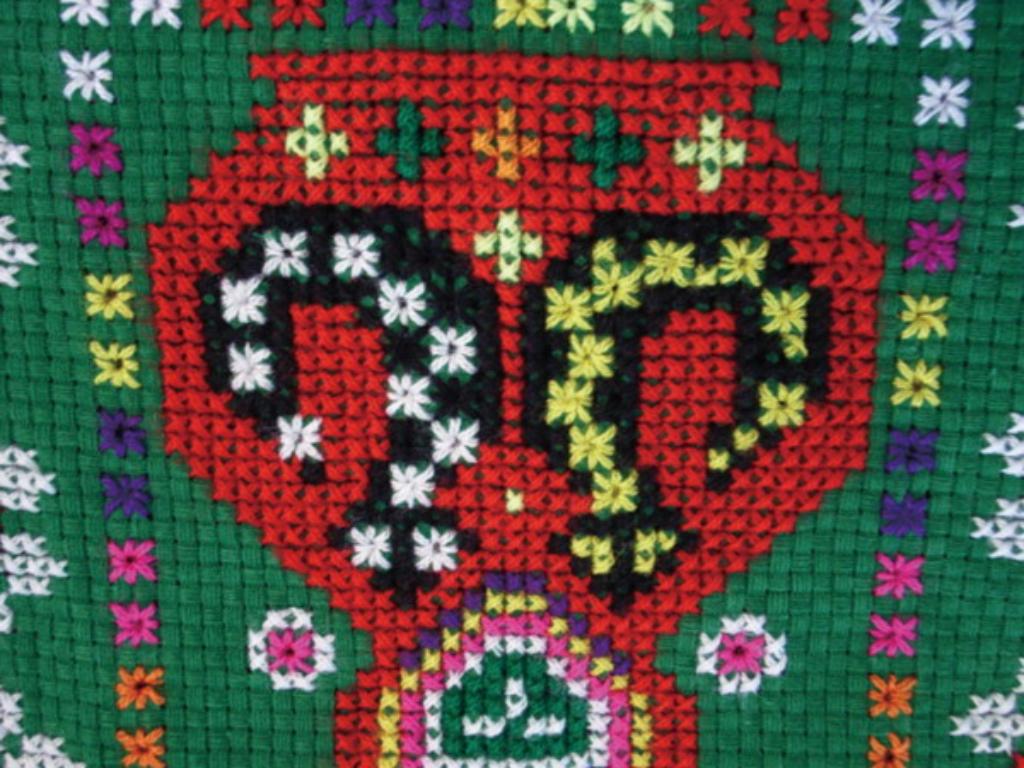 當七、八月小米豐收時,排灣族會舉行一連五天的「豐年祭」,與昔日農村秋收後舉行的酬神平安戲有異曲同工之妙,皆是感謝神靈眷顧而舉行的慶典。「豐年祭」的活動儀式包括:招請祖靈、送惡靈、送善靈、男子出獵等。伴隨著各項儀式的進行,族人會一起跳祭祖舞、祈福舞、豐年舞、農耕舞等。陳利友妹在〈豐年祭〉作品中,以類似記事的方式用針黹做鋪陳。百步蛇立於中央,分列兩旁的身著華麗的貴族,扛著山豬的族人及勁歌熱舞的平民。「如何將繽紛的顏色處理得恰到好處呢?」我問。陳利友妹笑著說:「小時候媽媽就告訴我,配色的時候要像JULIES(原住民語,一種類似小米的植物)一樣,顏色就會漂亮,我只是聽媽媽的話,看植物的顏色而已!」陳利友妹謙遜地說,卻一語道出,師法自然是藝術的最高境界!