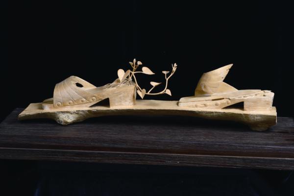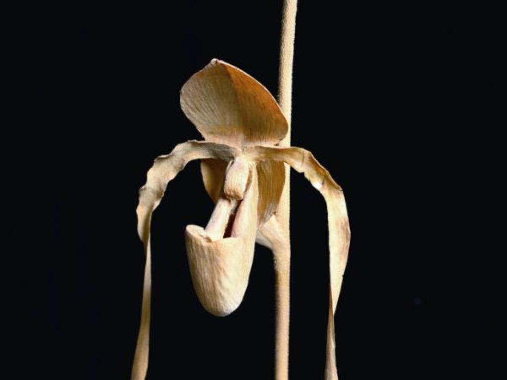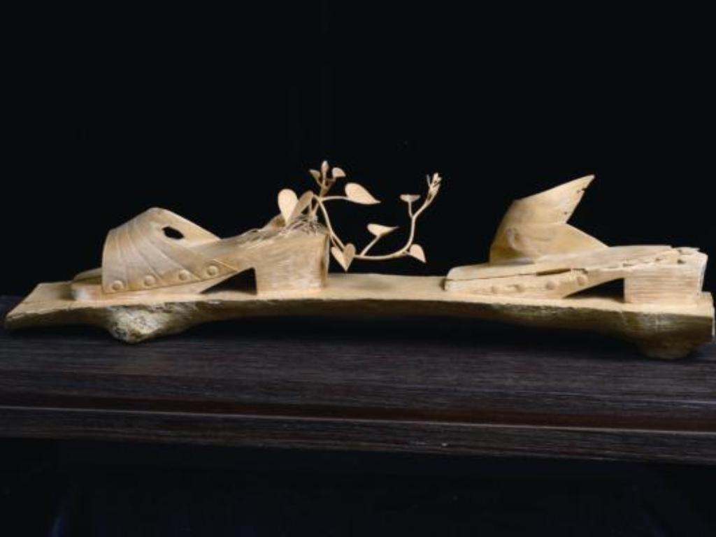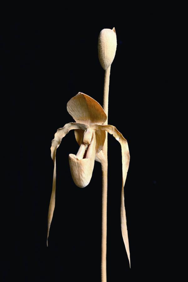 有「仙履蘭」、「淑女拖鞋」、「女神之足」之稱的拖鞋蘭,奇異的造型總受愛蘭者垂青。擅長雕刻蘭花的蔡清鈿在〈拖鞋蘭〉中,將蘭花的袋曩與花瓣刻畫出鮮嫩、輕透的質感,蘭莖上的毫毛;挺勁的蘭葉,細膩表現葉脈分明的紋路,表現出其特殊的形態與韻味。