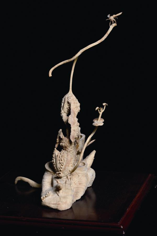 「要創作就要與眾不同!」書雖然念得不多,但蔡清鈿深知要從「匠」轉成「藝」勢必要有自己的風格,他選擇以細膩的精雕入手。「剛開始不知道木材的性,檜木、牛樟都刻不出我要的感覺,直到用到黃楊木,才覺得對味了!」主要係因黃楊木的延展性及透光度較佳的緣故。