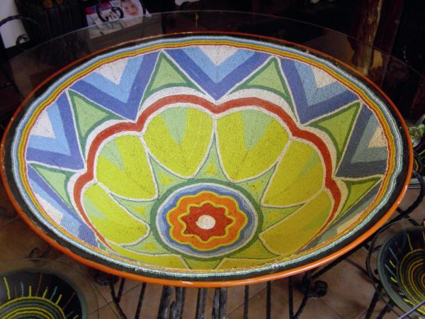 〈圓滿琉璃桌〉則是以原住民昔日用的大鐵鍋延伸出的作品。施秀菊先畫上圖案,再將琉璃珠一一串上去,最後覆以玻璃,桌子大小足足可容納八個人,是蜻蜓雅築的鎮店之寶。作品中間豔紅如花的是太陽,它綻放光芒護祐族人,並照耀出排灣族群之美;周圍的菱形圖騰與大地色彩做互動,交織出粗獷的線條與動感,傳達出原住民樂天知命的純樸性格。