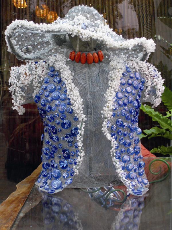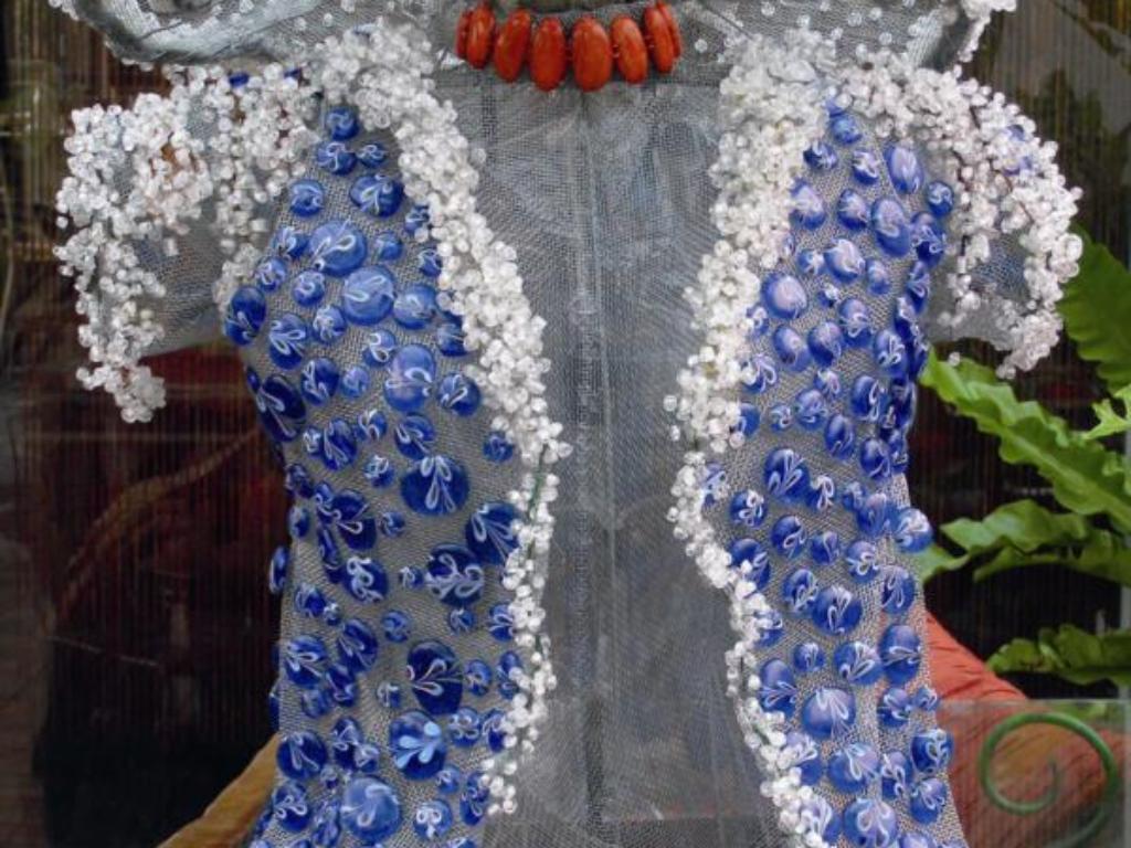 施秀菊的排灣族名字叫日夢日縵,〈日夢日縵的彩衣〉即依其名創作。作品中藍色晶透的琉璃珠流竄著孔雀斑麗的彩紋,透過二度燒壓製成扁平狀,珠子後方皆以磁鐵固定,再附著於鐵絲衣上。如此,藍色琉璃珠的衣身,搭配白色小串珠作成的帽子與衣袖,形成了美麗的華衣。該件作品曾獲得原住民手工藝比賽第二名。