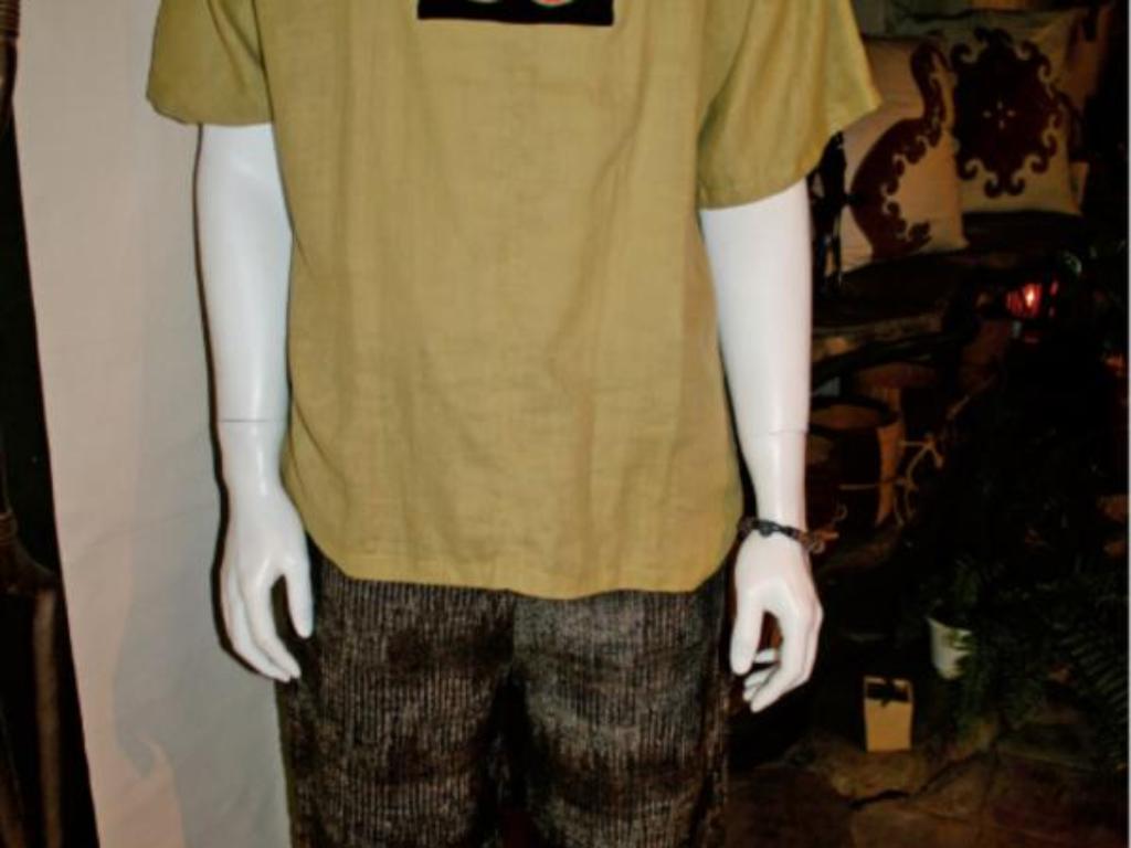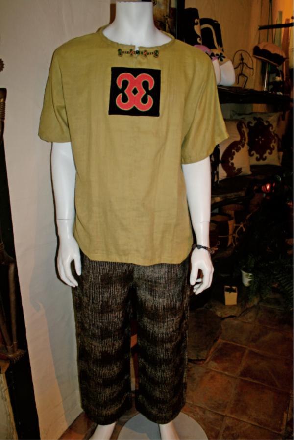 「彭春林布落空間」的入口意象即是蝴蝶,他運用蝴蝶的觸鬚為圖騰進行轉化,這樣的轉化也可在他的作品中看見。〈蝶紋上衣&手織布長褲〉以植物染的棉質T恤上,正方形的黑布上繡以綠色絲線,兩個紅色背對背的3,交幻出中央的菱形,整齊排列的針紋,令人想起密密縫的針黹情。