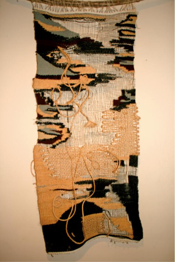 綴織作品〈心情〉則是彭春林現實生活的反射。當年他在輔大進修織技,搭夜車返臺東的路程上,窗外一片漆黑,他的身體疲累,心情卻因為學習而充實,這個情景重現在作品黑灰色構成的夜色上,鬆緊不一的織紋則是心情與生理的反射。