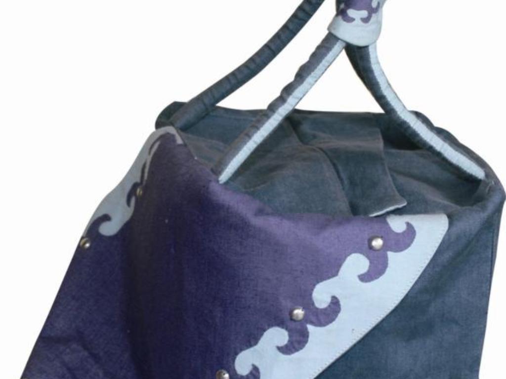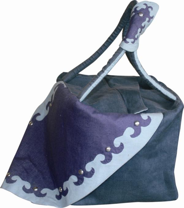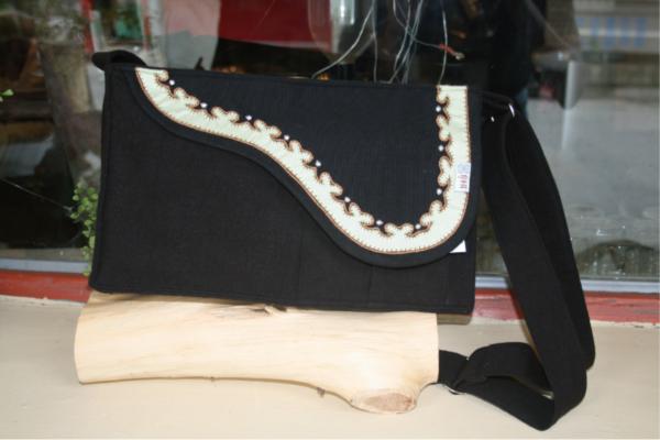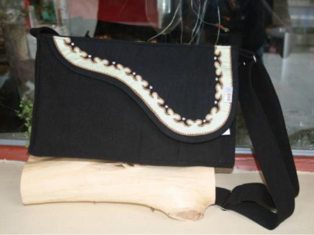 「魯凱新衣系列」的手提包是彭春林從平面跳脫到立體的嘗試,不同層次的藍為手提包帶來變化,略傾斜的造型也顛覆傳統,風格別具。〈蝶紋側包〉的黑白對比色則讓人眼睛一亮,它和前者一樣,也以針線的手感串連出蝴蝶的飛翔的躍動。