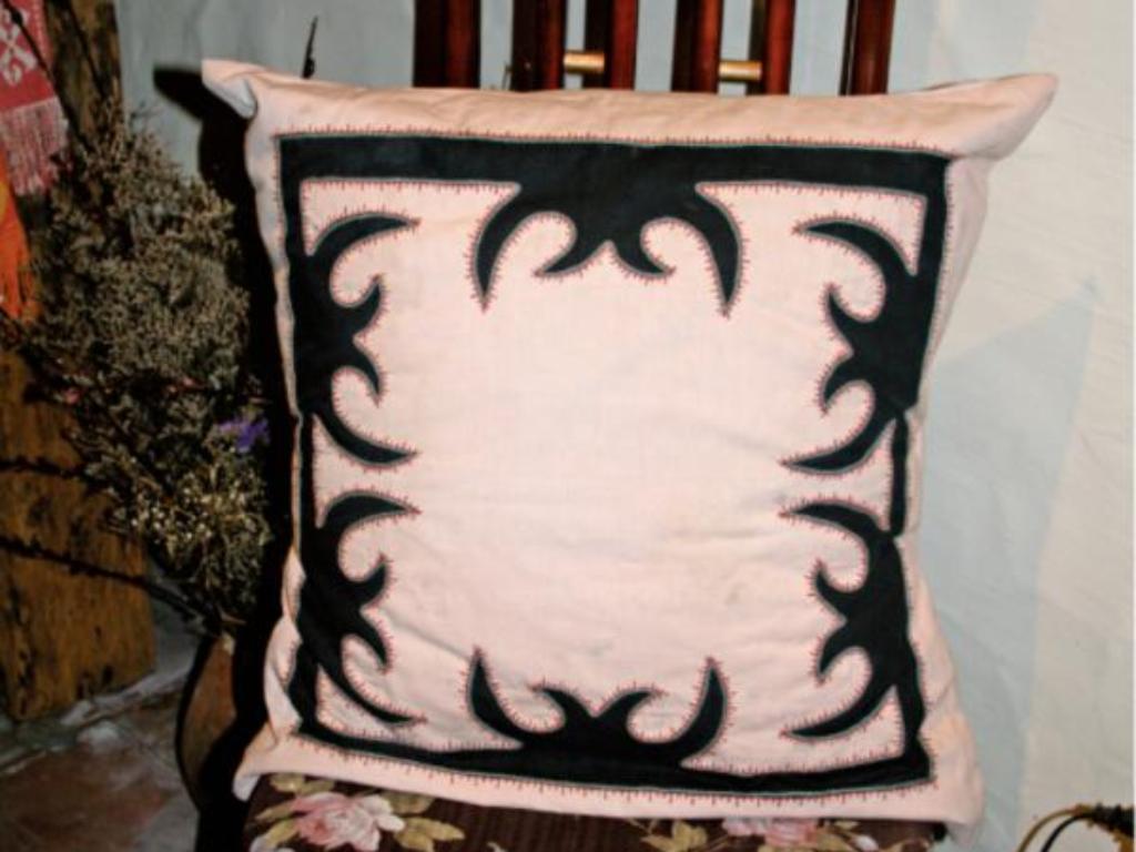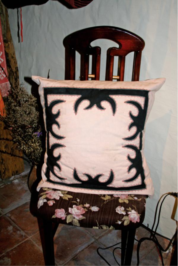 在衣飾配件外,家飾也是彭春林的專擅領域。在〈植物染桌燈〉中,草綠色的布繡上如蝴蝶觸鬚般的紅色線條,其粗細變化讓視覺從上而下,再由下而上,具有蝴蝶生命循環的意涵。〈蝶紋抱枕〉亦顯現創作者細微的用心。多數的抱枕圖案具有正反之別,顧及到居家的隨性,彭春林將抱枕的紋飾設計成萬變不離其宗,也就是說,無論使用者如何擺放、旋轉,它永遠是端正的姿態。細看此抱枕長短不一的縫線不知凡幾,便可知其做工之精細。