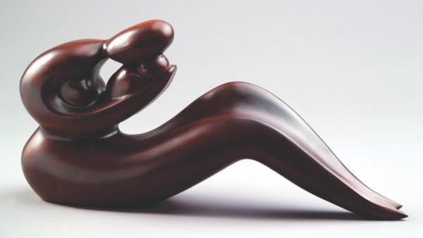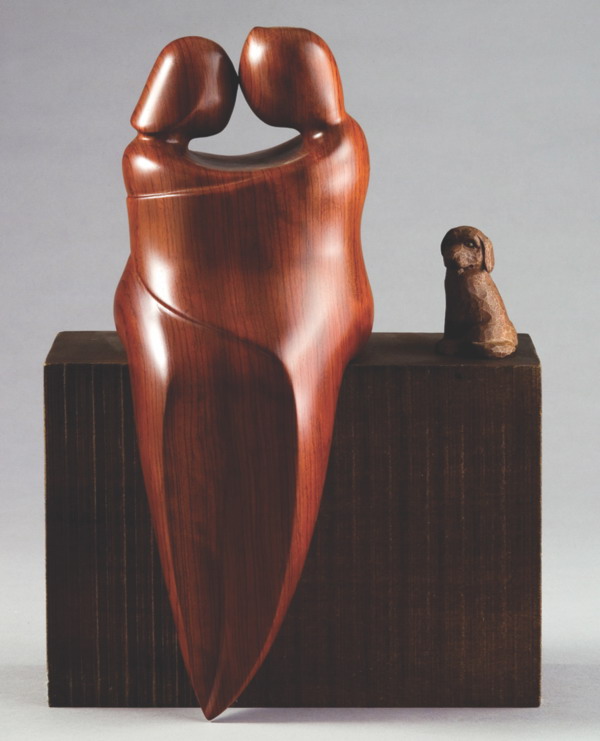 透過精細的觀察與速寫,曾文章總能恰如其份掌握作品的情感。〈悠〉刻畫即將臨盆的孕婦,一派悠閒斜躺在月型的沙發椅上,享受著與腹中胎兒的互動;〈和樂融融〉則以抽象、簡潔流暢的造型,表現一家人環抱在一起的親密互動,映照出作者對幸福的定義就是親子間和樂融融。