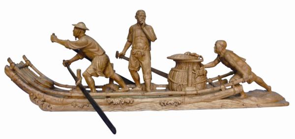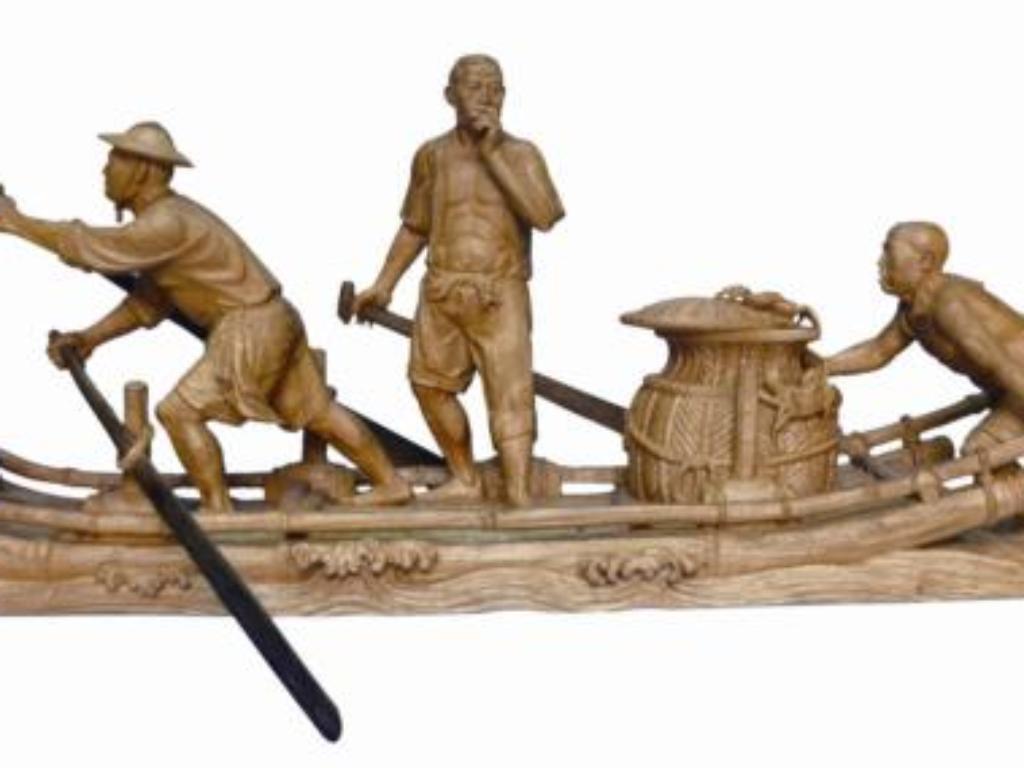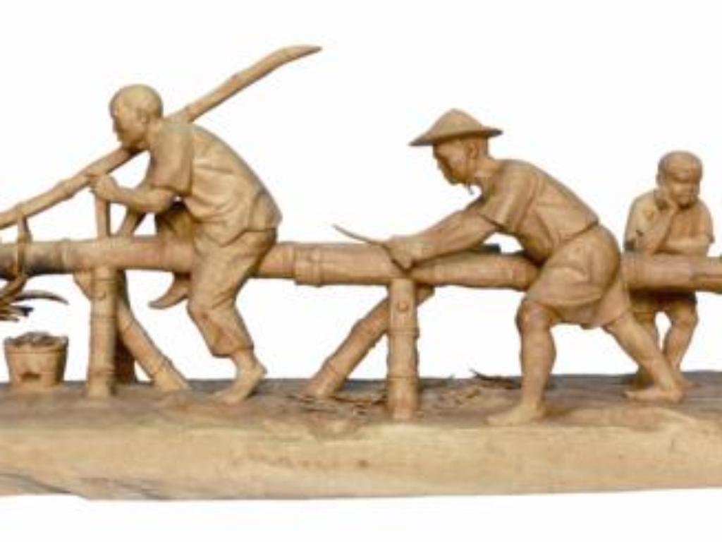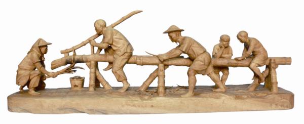 竹筏是討海人的謀生工具之一,製作竹筏也是一門專業技術,通常以麻竹或刺竹經過層層的處理與通力合作始成。〈刨竹、熨竹〉即呈現了竹筏製作的過程。老、中、青沿著竹子一字排開,熨竹、刨竹、修作細節等,各司其職,婦人則以火熨烤竹子使其彎曲,童子在一旁托頤觀看。和〈天時〉一樣,這件描繪了三代合作的作品,隱含著文化傳承的意味。