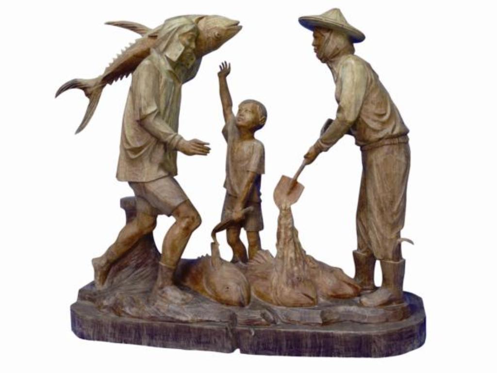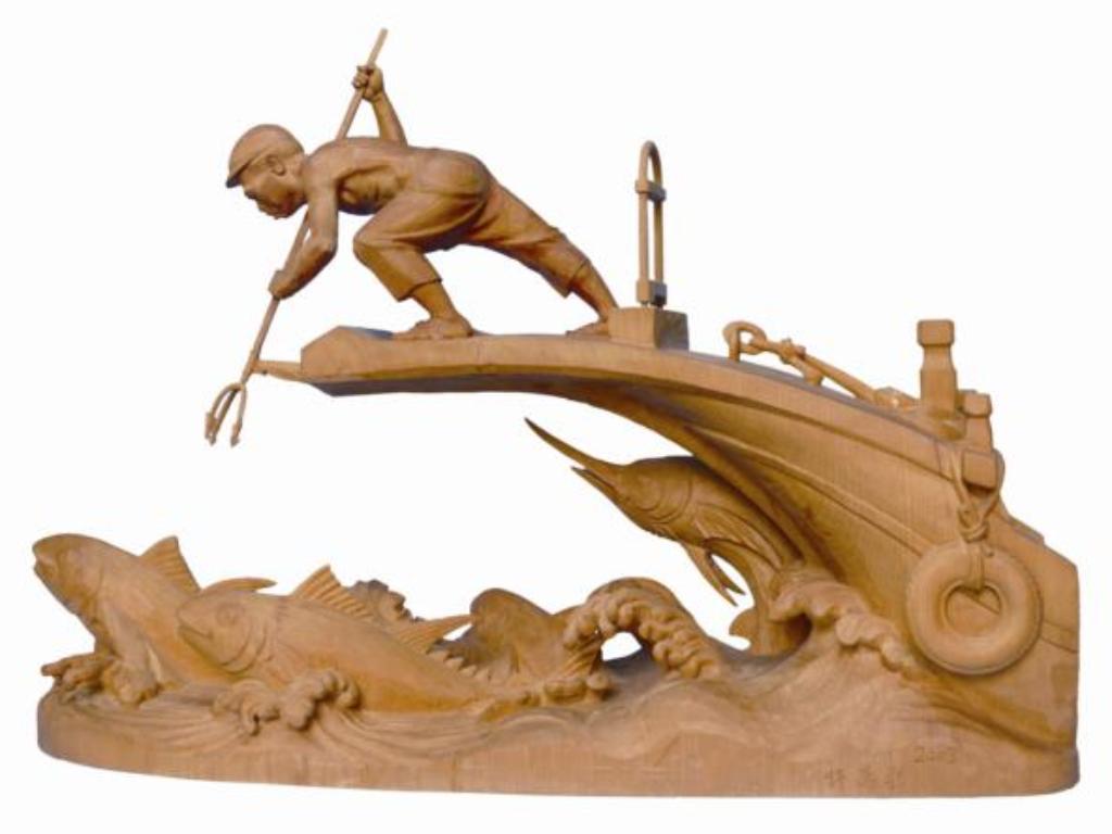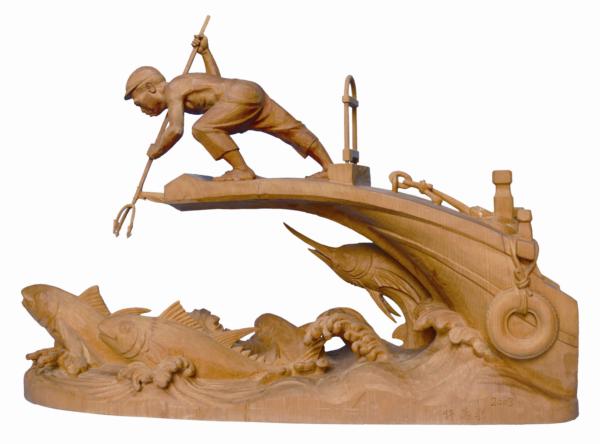 在許萬利以寫實手法雕刻的〈鏢魚郎〉中,站在鏢魚台上彎身雙手持三叉魚鏢獵魚的姿態,令人觀之生畏,因為在滔滔大浪中,在行進中的漁船上,跟大型、迅速與長矛嘴吻的魚類搏鬥,稍一不慎就可能葬命深海,加上特殊造型的鏢魚船,海中掙脫鏢叉亂竄的旗魚、鬼頭刀等,許萬利以雕刻刀刻畫討海人與大海搏鬥的宿命與文化傳承。