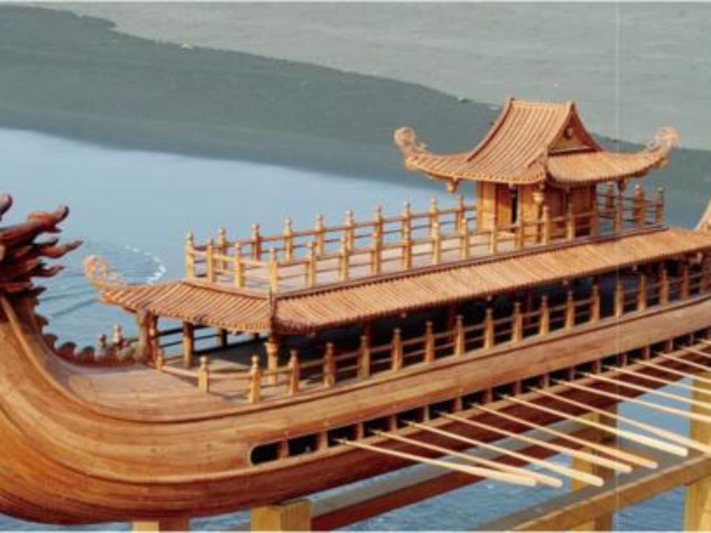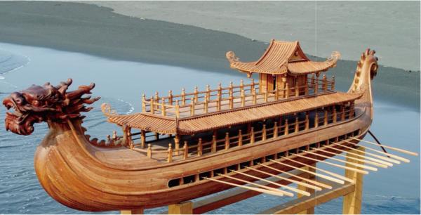 另一艘華麗的〈龍舟畫舫〉,靈感則來自隋陽帝下江南。根據史籍記載,從東都到江都的運河剛剛竣工,奢華無度的隋陽帝即帶著二十萬人馬下江南。因為遊河者為一國之君,因此洪全瑞以中國帝王之圖騰──龍為船之造型,第一層為划舟手室,兩邊各14槳,第二層為皇帝的娛樂廳,舞樂似乎從中流洩而出,第三層觀景台,作品之豪華將隋陽帝豪奢展現無遺。他表示,在建這艘船之前必須先將人的空間比例算出,再一木一木進行拼裝,如同疊磚蓋瓦;此外他堅持以刨光而非磨光處理,以顯示真材實料與功夫。