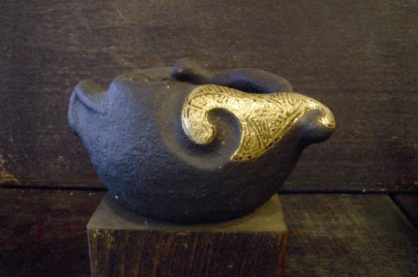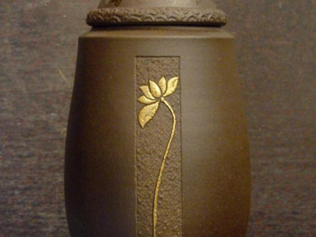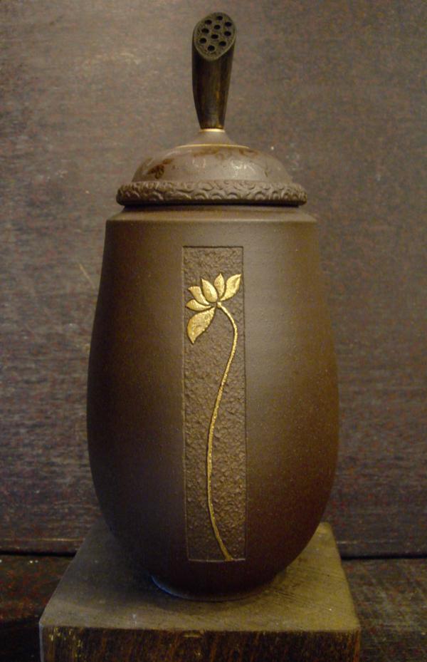 凸出,才有被看見的機會,因此,每個藝術創作者莫不竭盡心力,創造出自己獨特的技法與風格。張家興歷經多年,以相思木木灰調製出自然的釉色,使其作品呈現自然古雅之趣。〈蓮心茶罐〉以蓮花生命週期為表象,實則意喻生命的循環──生滅有時。壺紐以檜木雕出蓮蓬造型,下方鋪陳出兩條金色緣線,蓋子周邊則雕以中國圖騰紋飾,由上而下,表現出生命的生息本質,作者更藉由陶作冥思生命的真諦。
