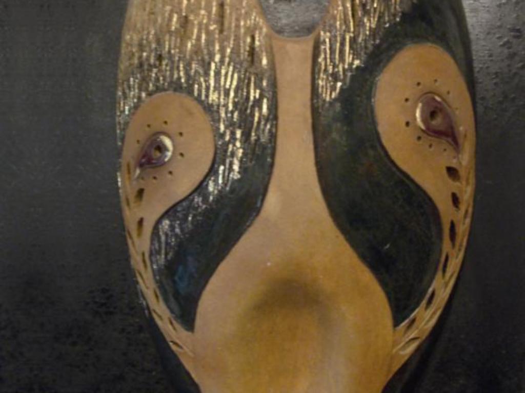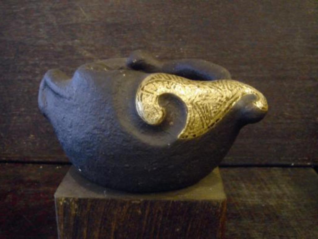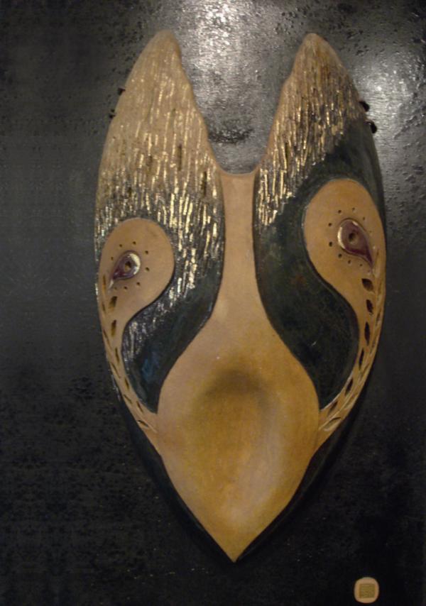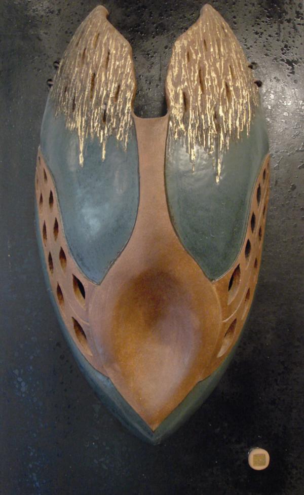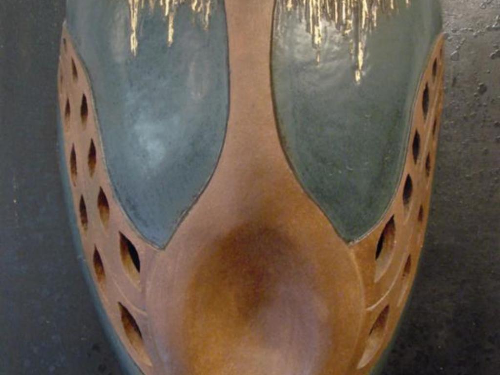 相較於張家興的細膩溫雅,半路出家的吳玉玲,其作品則呈現豪邁不拘的粗獷生命力。〈黥面燈飾〉係以早期泰雅族原住民臉上的刺青為題,一公一母。吳玉玲以第三者的角度詮釋原住民過往的文化特色,作為回溯象徵生命特質與莊嚴符號的巡禮。作品如同面具的造型,以金色流蘇、鏤空雕飾、色澤及形體的變化,表現男女的陽剛與陰柔,讓人深感參差交錯的情趣,使實用的生活陶也能具有藝術造型與意涵。