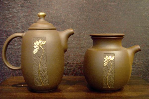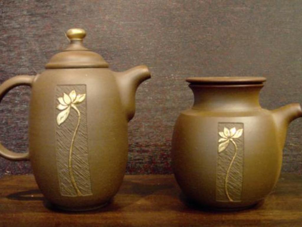 〈蓮心茶韻壺組〉有西洋造型的壺身、圓潤飽實的壺嘴,一朵純金出水蓮花則挺立於壺身上。為了創造視覺的多層次感,張家興以刻刀作出一凹一凸的斜紋,突顯蓮花的卓然美姿,延續壺身的金,壺紐亦以同樣質材塑之,一旁的茶海亦以同調性作搭配。同屬於近期作品、型制相仿的〈蓮心行草茶罐〉,其罐身與壺蓋串連出圓融之氣度,搭以牛樟木雕刻而就的橢圓壺紐一脈相貫,為凸顯金色荷花的貴氣之姿,壺紐之木頭質感與之相呼應。張家興於繪製蓮花之前先上一層化妝土,使其呈咖啡色澤,並以篆刻刀鑿出陰陽肌理,烘托出更多層次的視覺美感。