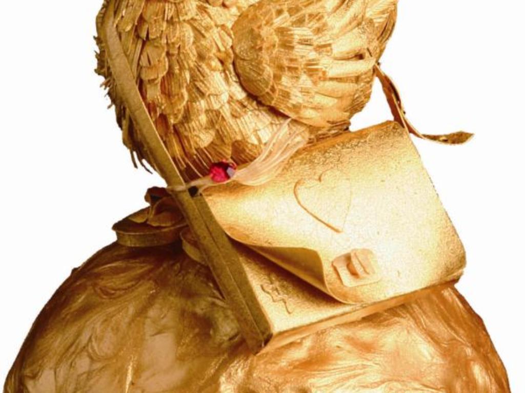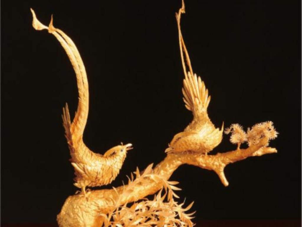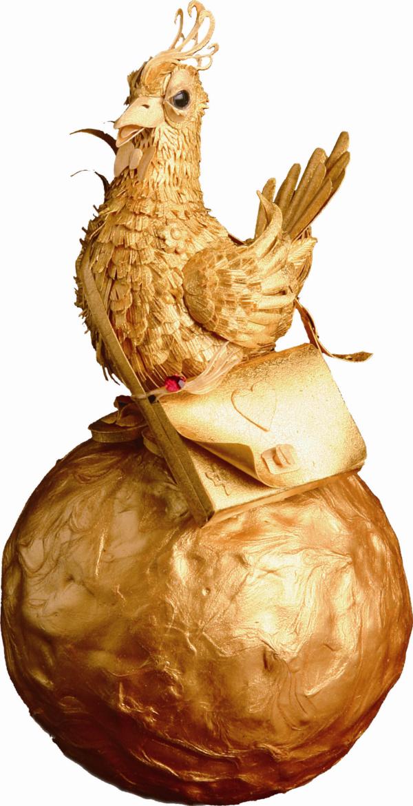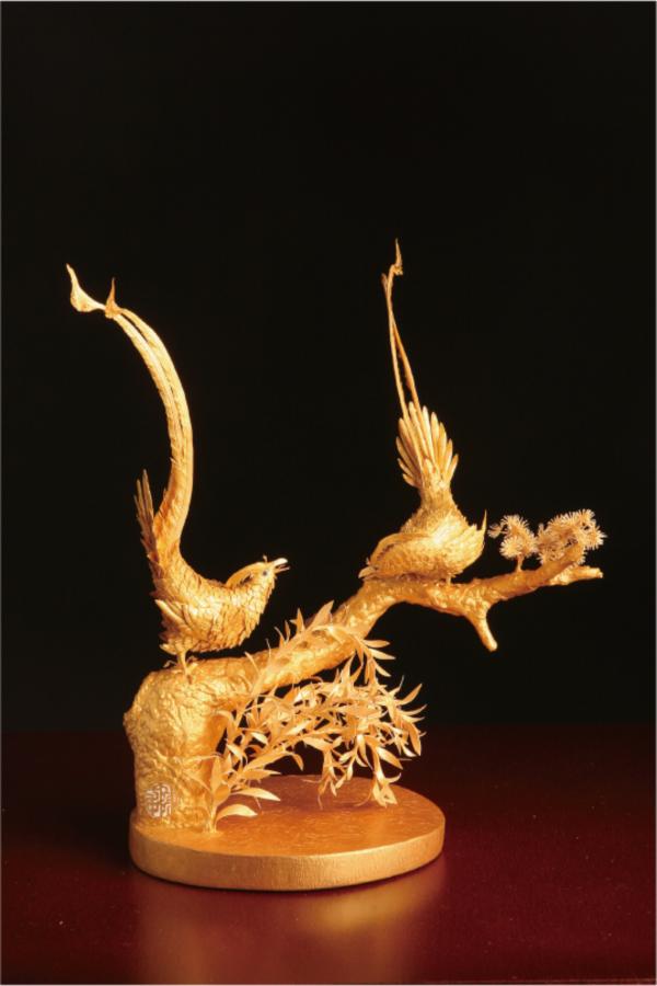 日本有招財貓,中國則有象徵吉祥的金雞。〈招財鳥〉即以招財貓為藍本,取金雞為樣,「招財進寶」的意思便渾然天成了。個性開朗的陳一中雕製的金雞頗具趣味,踩在金球上的金雞背著大書包,上頭還雕著一個愛心和鑲掛著紅寶石,腳上則趿拉著夾腳拖,隨性而可愛。