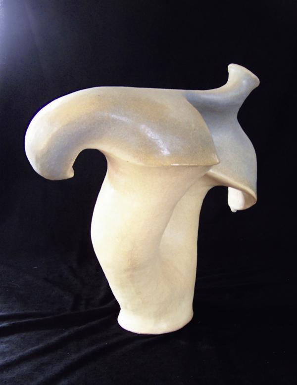 春雷初響,大地萬物甦醒,萌芽生長,宣告春天來了!這正是農民曆上二十四節氣中的「驚蟄」。據民間傳說,驚蟄的節氣神是「雷公」。相傳「雷公」是一隻大鳥,隨身拿著一支鐵鎚,就是他用鐵鎚打出隆隆的雷聲,喚醒大地萬物,人們才知道春天已經來臨了。2006年,周美智以「驚蟄」為個展主題,創作了一系列的作品。〈驚蟄〉壺型係以鳥之型態演變而來,呈現律動姿態,壺身下還作了如鼎的腳,完成鳥的意象形式,其扁中帶圓的壺身則予人細緻之觸感,民俗傳統中廟宇的飛簷與窗花也是周美智創作的題材之一。