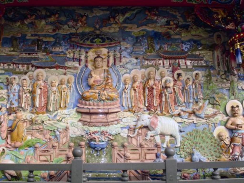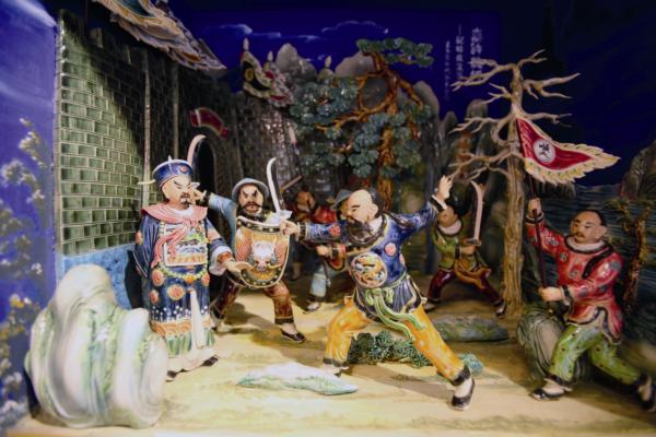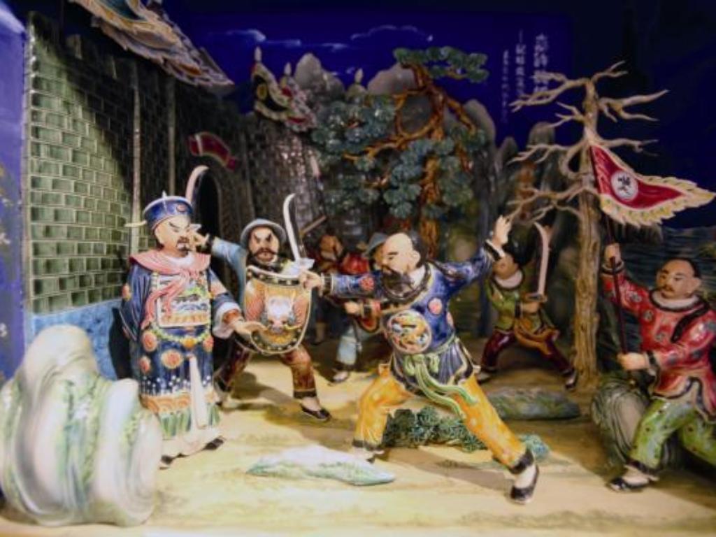 招財進寶是中國人常用的吉祥話,因此,無論繪畫、工藝皆常以此為主題。民間供奉的「財神」角色眾多,謝東哲的〈招財進寶〉以中路武財神趙公明為首,帶領東、西、南、北等財神。民間傳說趙公明的坐騎是黑虎,但或許因交趾陶向來顏色鮮麗,故作者以接近現實的老虎為表現。五路財神中有手執金元寶、如意的財神,童子更推著裝滿元寶的車子,每個人物皆栩栩如生,彷彿正載送金銀財寶到人間。