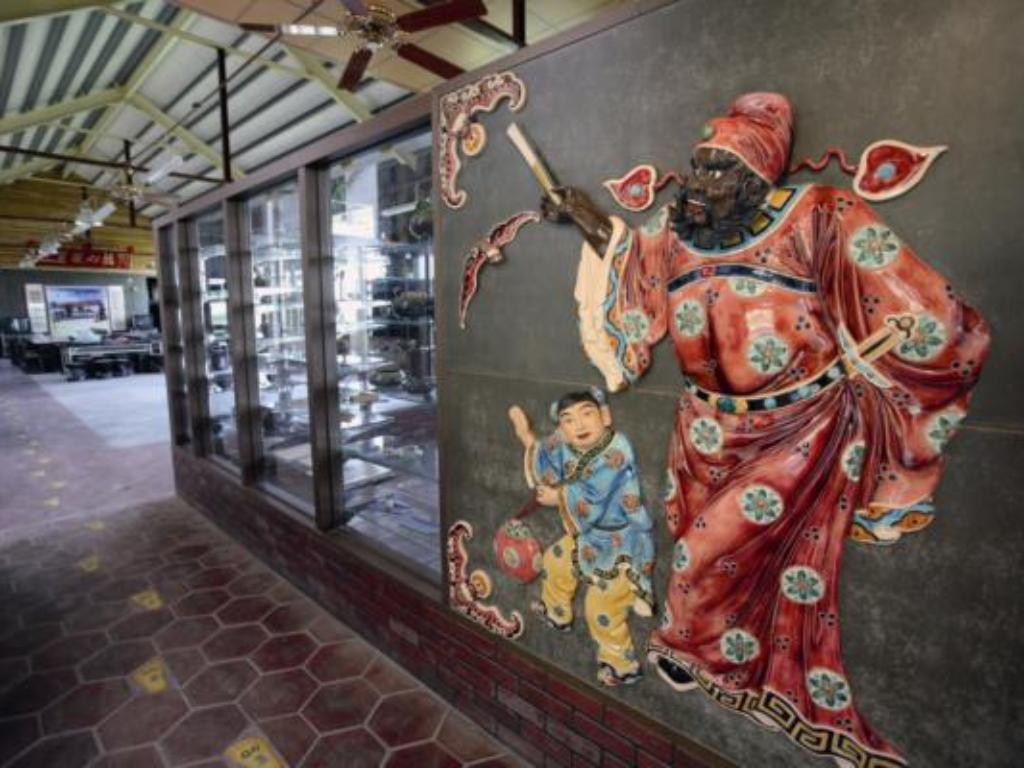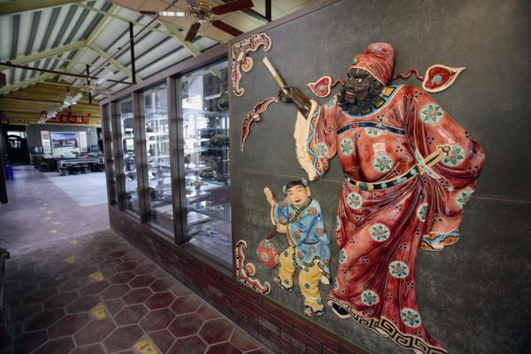 交趾陶集中國南方之繪畫、雕塑、燒陶於一身。在〈五福臨門〉作品中,鍾馗身著以胭脂紅為主色的衣帽,綠、黑、黃、藍點綴其間,腰配寶劍,手持扇子揮向蝙蝠,面露笑意,神韻生動;因動作而產生的衣衫皺紋,則彰顯創作者繪畫與雕塑功力。作者取蝙蝠的諧音「福」為主題,藉鍾馗揮扇招「福」,具有福在眼前、五福臨門之意。