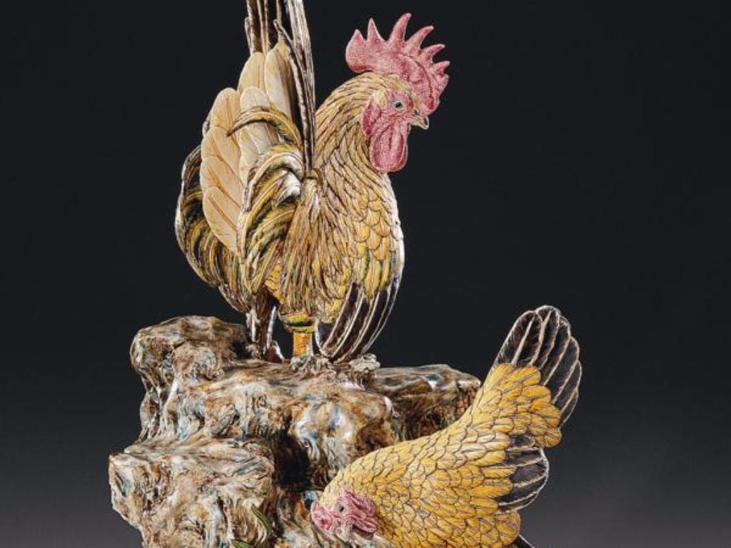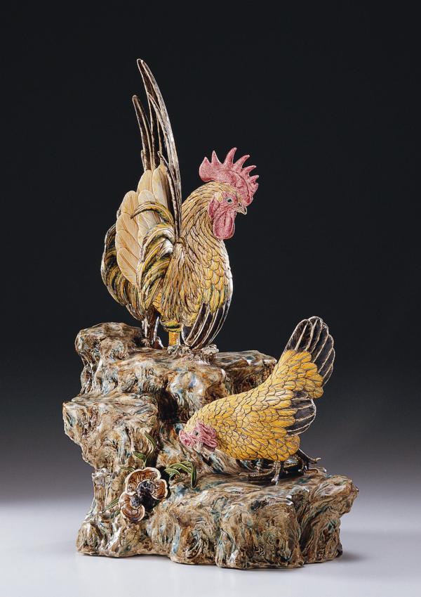 中國書畫、工藝中喜以雞為題,因金榜提名中的「提」字與「啼」同音,是恭賀及第餽贈的佳言,閩南一帶則因雞的臺語與「家」的臺語同音。〈金雞報喜〉亦取「家」之意,蓋家為國之本,家安則國固,金雞更是富足充裕的表徵,而在岩石上的靈芝則寓意如意。此作中的公雞登高臨下,眼睛注視著正在覓食的母雞,昭示雄性保護雌性的天經地義。以手工製出的山岩肌理與栩栩如生的雞隻,令人驚嘆高枝明寫實的能力。