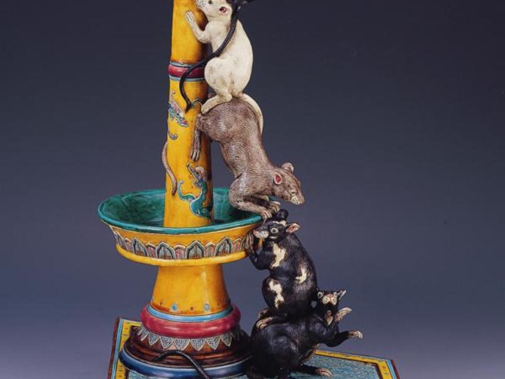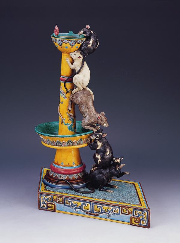 「小老鼠,上燈台,偷油吃,下不來……。」這是幼時的童謠,高枝明將其轉換成〈五子登科〉的創作題材,描繪三隻黑色、一隻棕色、一隻白色,共五隻老鼠以疊羅漢的方式攀高偷油吃。仿清朝宮中的燈台,以帝王之黃為主色,紋飾與設色典雅、高貴。五隻老鼠「攀燈」油台,具有「五子登科」之含意。