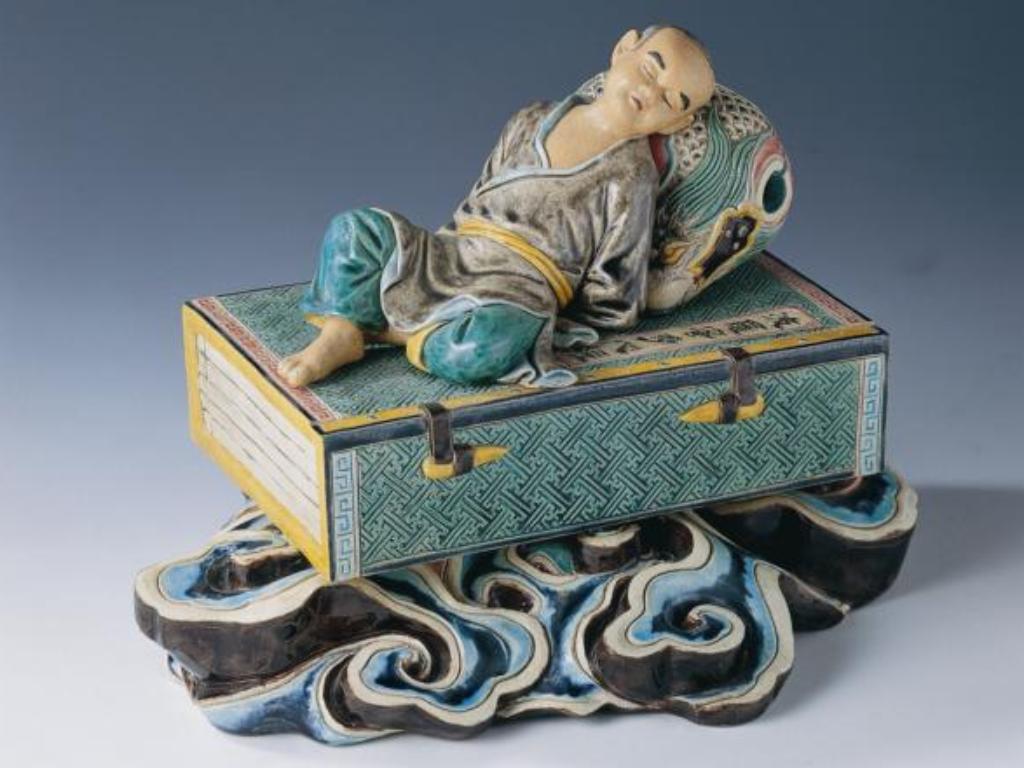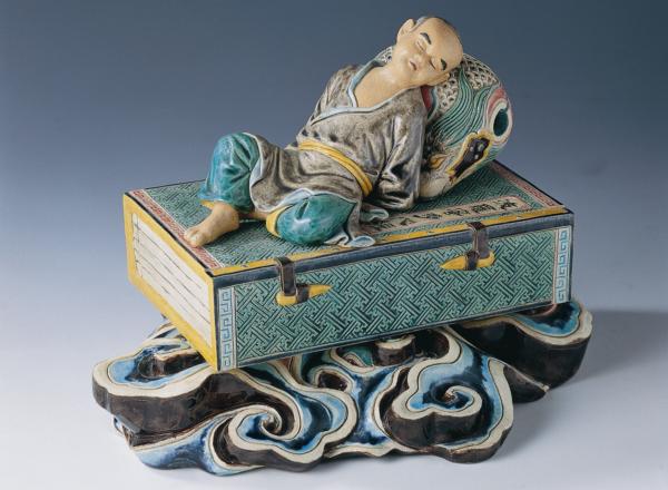 〈悠然自得〉則不禁令人莞爾與心生欽佩。在這件作品中,一個小和尚以《心經》為床,念經敲打的「木魚」為枕,酣睡中呈現安詳之神韻,意表小和尚連休憩中仍心繫佛法。此作之《心經》以卍字形雕畫而成,代表萬壽無疆之意。人物捏塑生動,顏色秀雅,與一般重彩之交趾陶有極大不同。