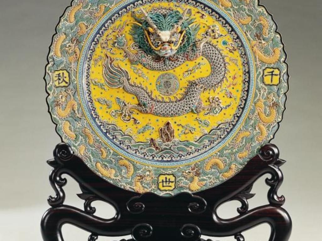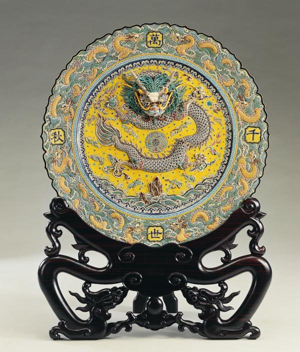 「龍」是古代神話傳說中的神靈之一,也是華夏民族尊奉的獨特神物。傳說中龍生九子,因此,高枝明將傳說化為創作〈大九龍盤〉,盤中的龍非禽非獸,非蟲非魚,身上有鱗,頭上有角,嘴邊有鬚,足似鷹爪,兩眼炯炯有神,彰顯其至高無上之尊。盤緣圍繞著九條龍,每一隻皆姿態各異,並於其上寫著「萬世千秋」,再飾以吉祥圖案。此作兩面皆有圖飾,故於燒製上更增加其難度,費時半年時間才完成。值得一提的是,前總統李登輝就職時,曾有官員請高枝明燒製此作,做為祝賀之禮。