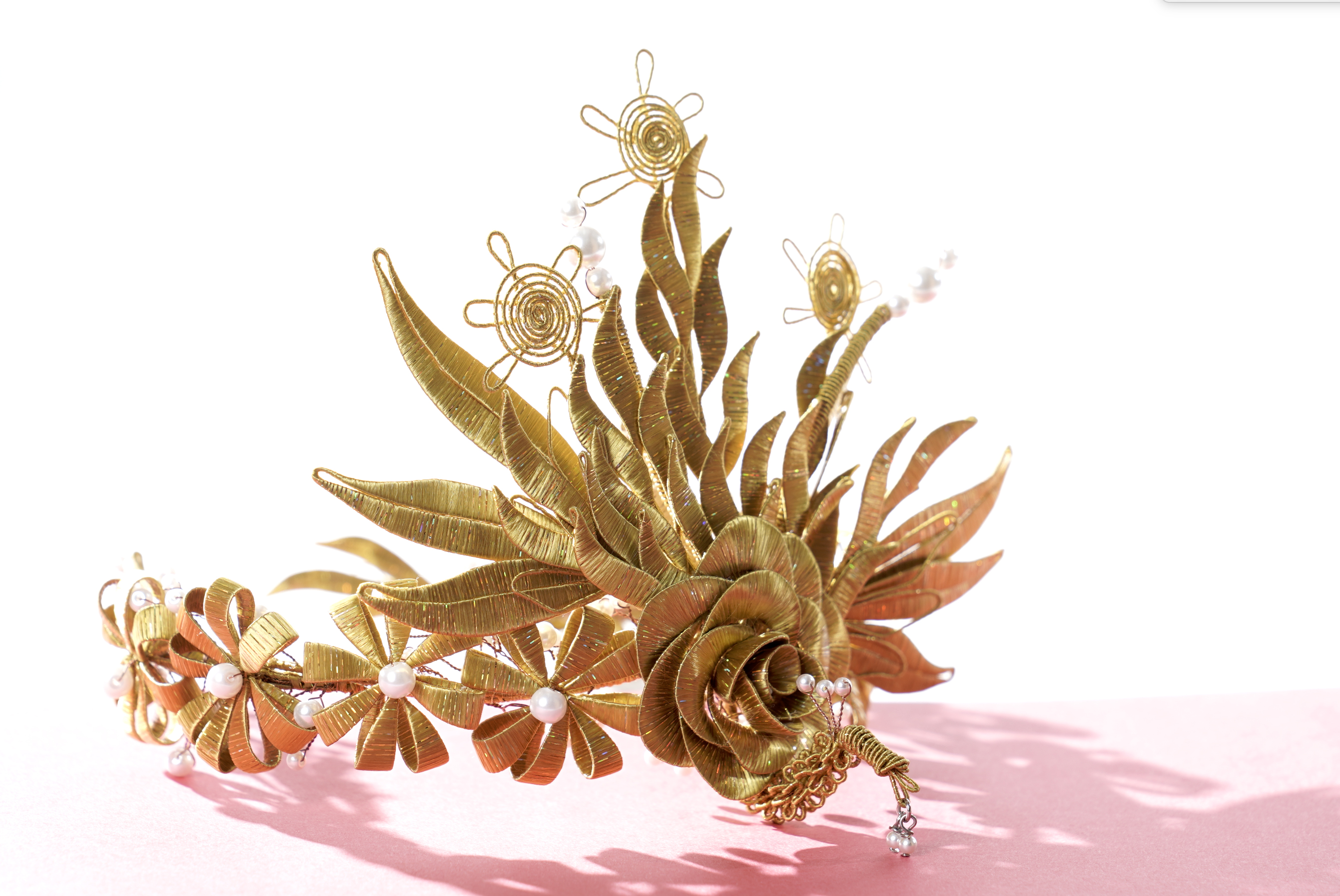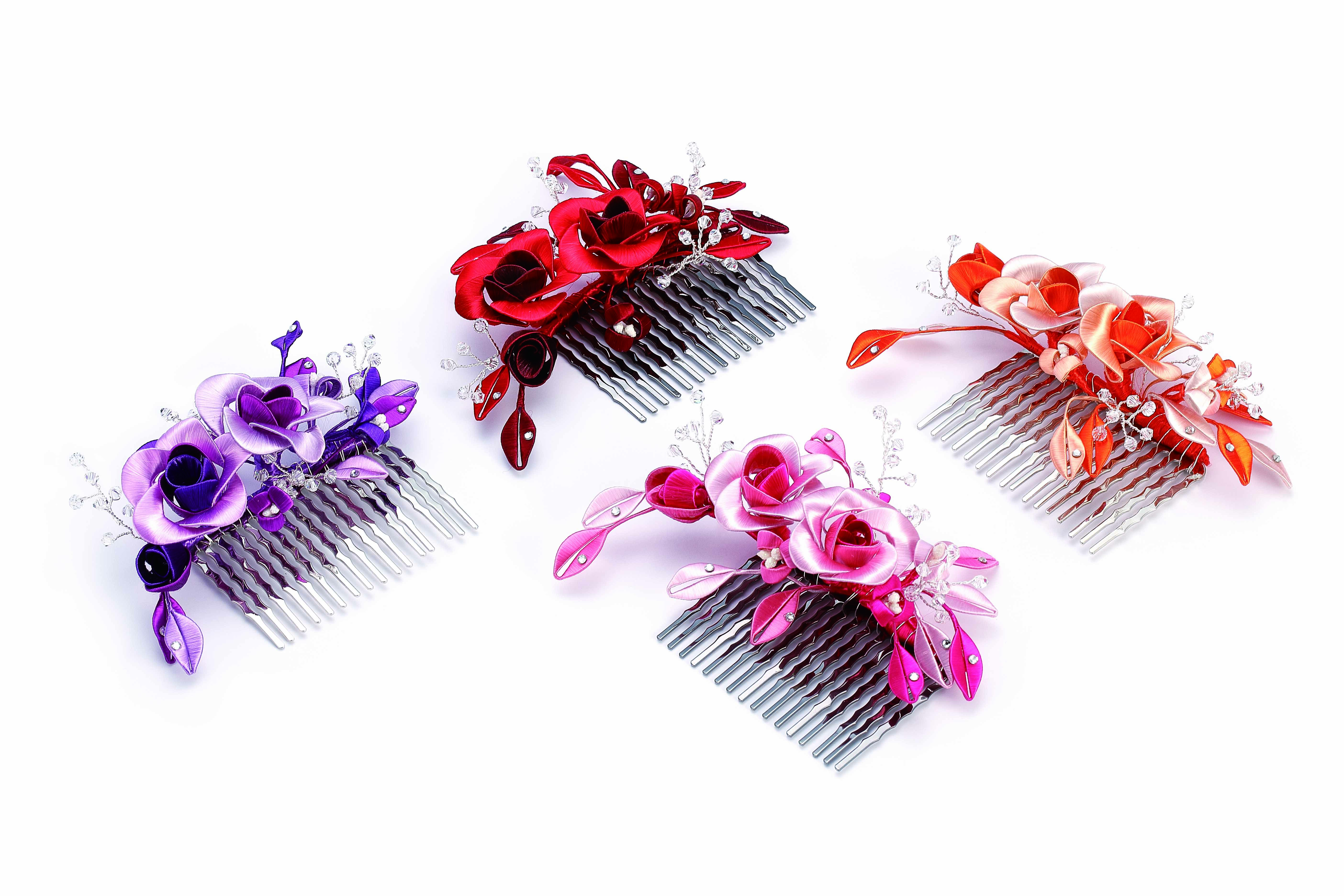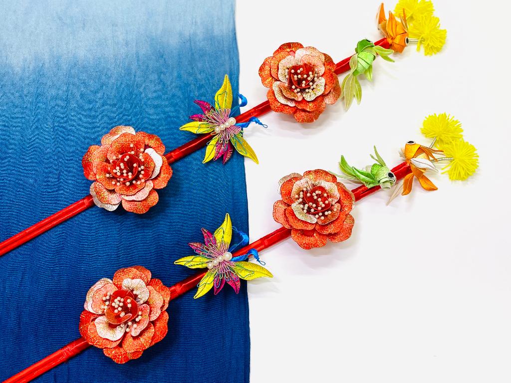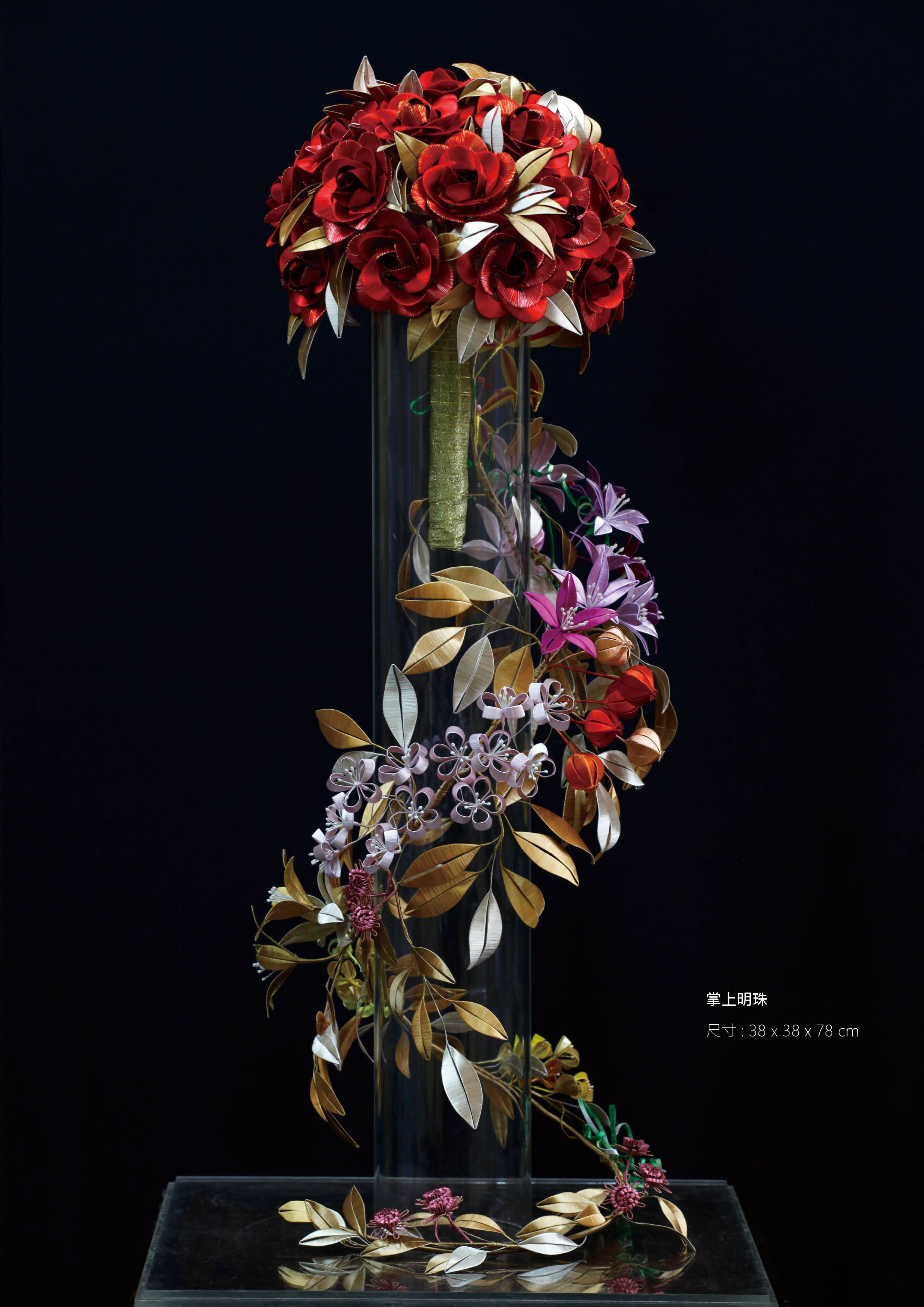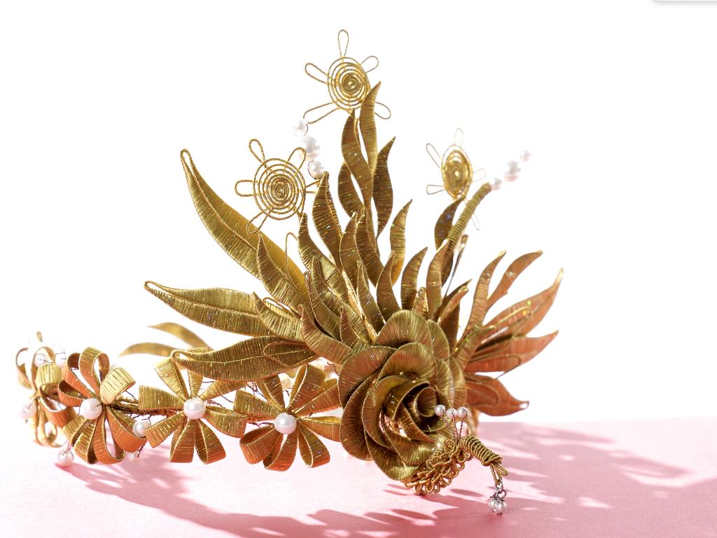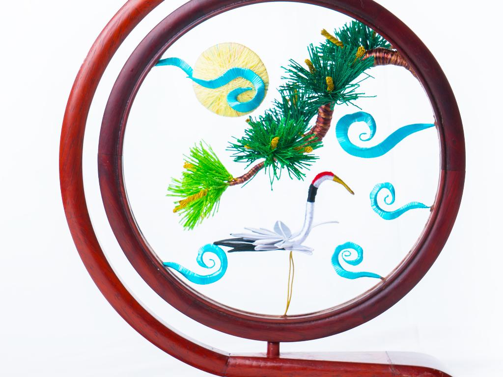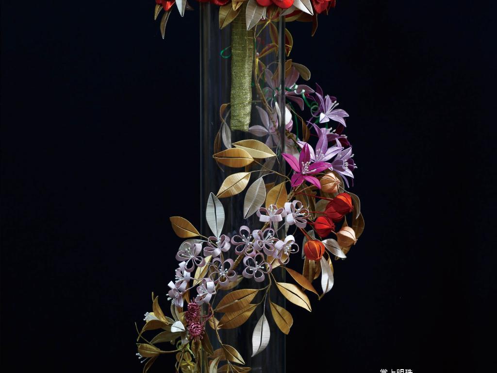 除了佛像與佛具,俗稱春仔花的纏花是另一門奠基於民俗信仰與婚喪喜慶的工藝。對來自雲林虎尾的林佩瑩來說,這也是一門引領創作者心靈成長與安定的藝術。她認為纏花運用於信仰與宮廟系統時,大多是無償奉獻的功德,若只依靠宮廟或民俗傳統的需求,勢必難以生存與傳承。因此,她決定從教學來著手。初學者的纏花練習必須依賴模版進行,需投注極大耐心,考驗著個人的細膩程度,但在技術的學習之外,林佩瑩認為思考自己投入這門技藝的期待為何更是重要,當享受其中,才能建立自己的認知與風格。她的學員先是透過反覆的纏繞動作,安定了躁動的情緒也和緩了生活的節 奏,再持續累積手藝與經驗,經由她的引導開發與創造出屬於自己的特色,以獲得青睞與客制訂單。纏花是一門創作彈性極高的工藝,許多年輕人學習後會靈活地與不同媒材做混搭,她非常樂見這樣的發展與融合。她也以身作則,不斷地突破既有印象、開發商品,例如創作男性專用的波洛領結,突破纏花多是女性裝飾品的印象;將纏花融入錫雕、剪絨、串珠、金屬編織、繩結等媒材;甚至運用於文具或生活用品,諸如以纏花點綴的文昌筆等,不僅融合傳統文化的概念,也增添文創品的特色風貌。