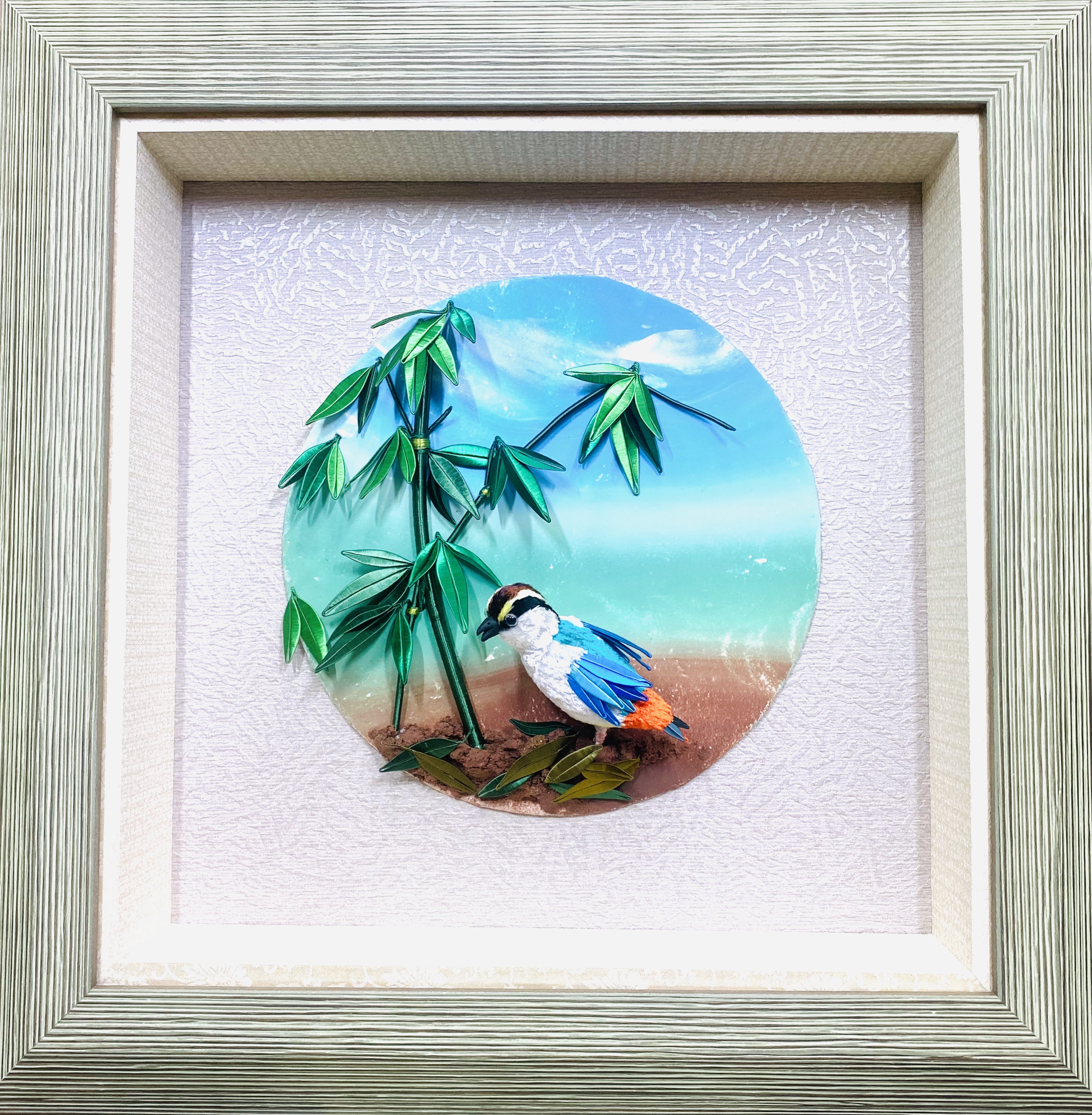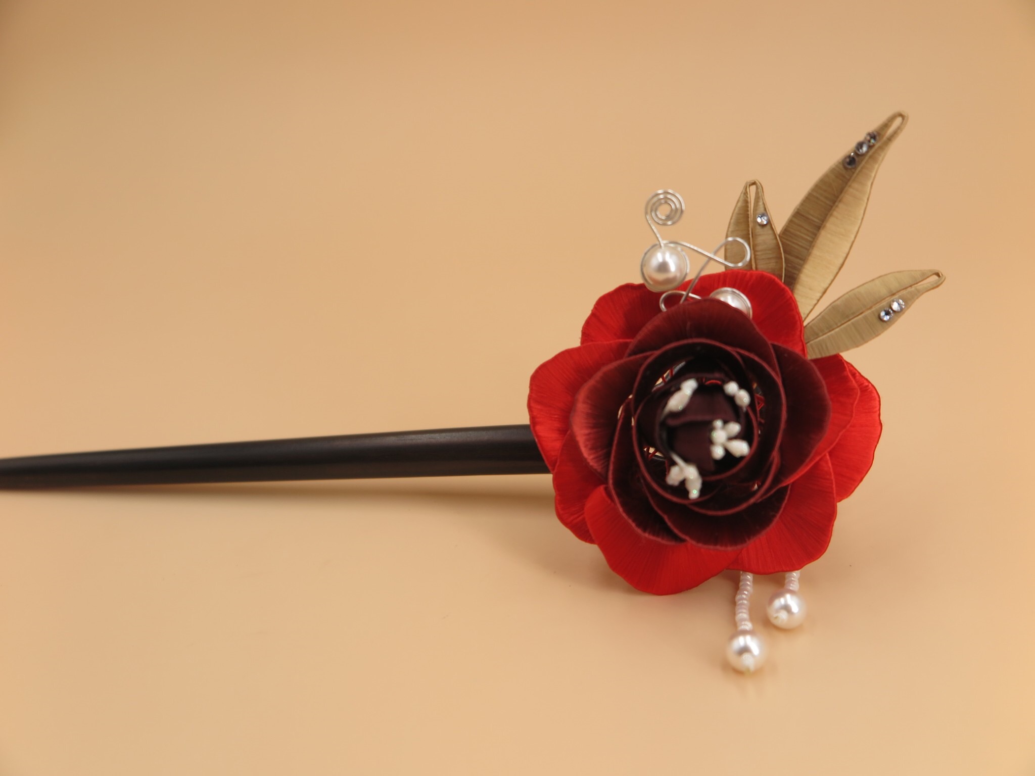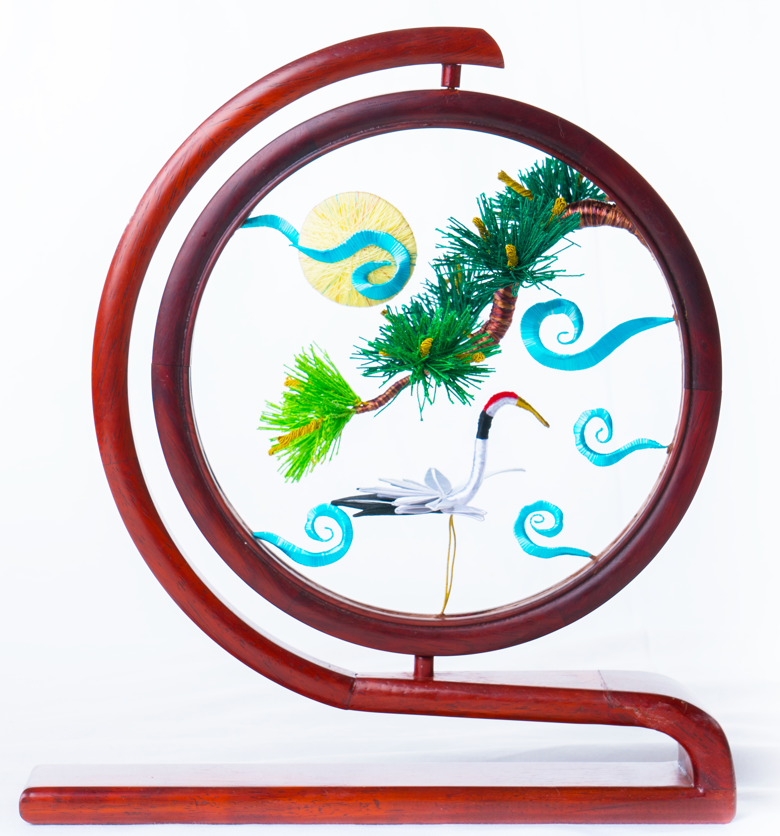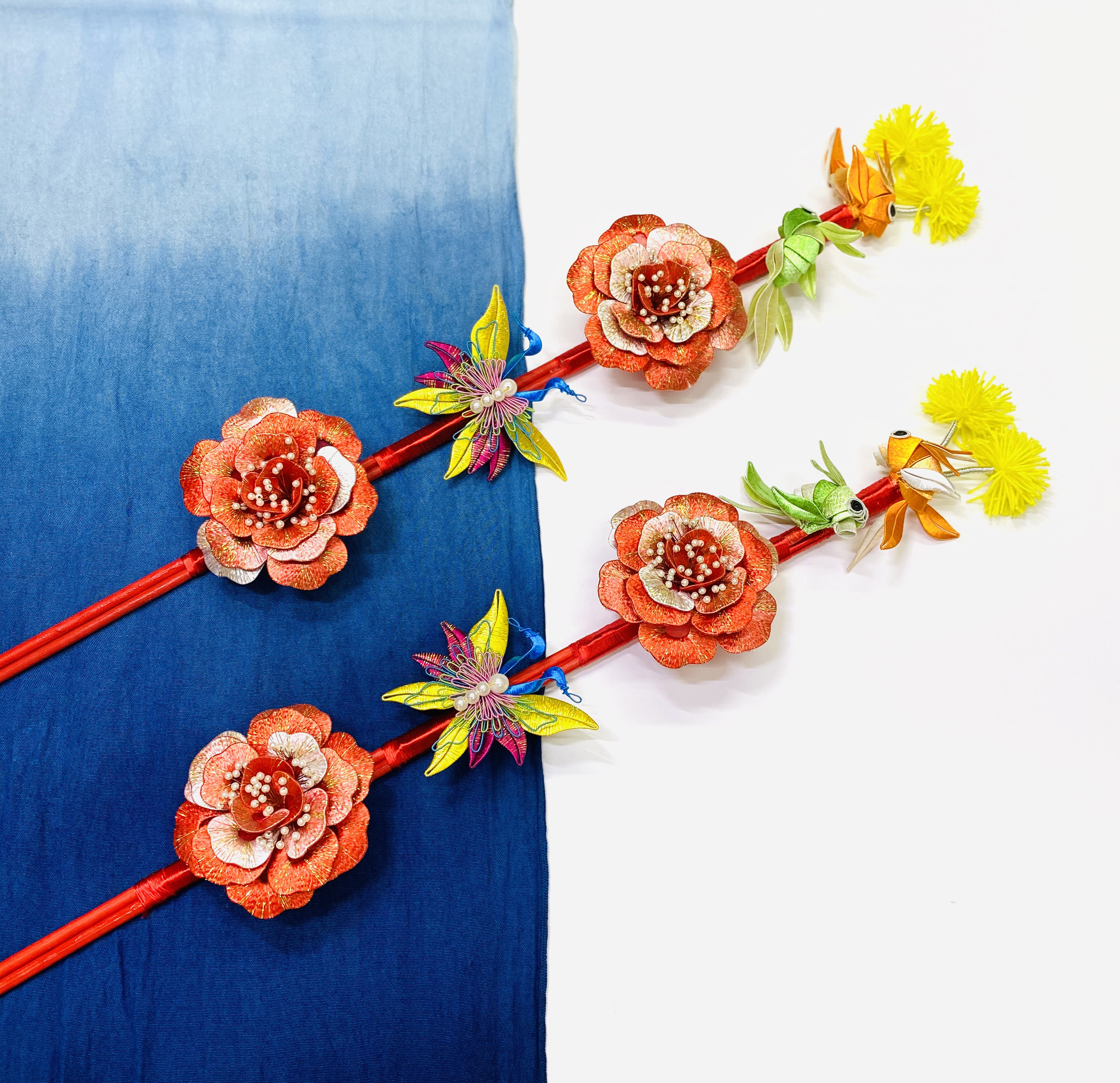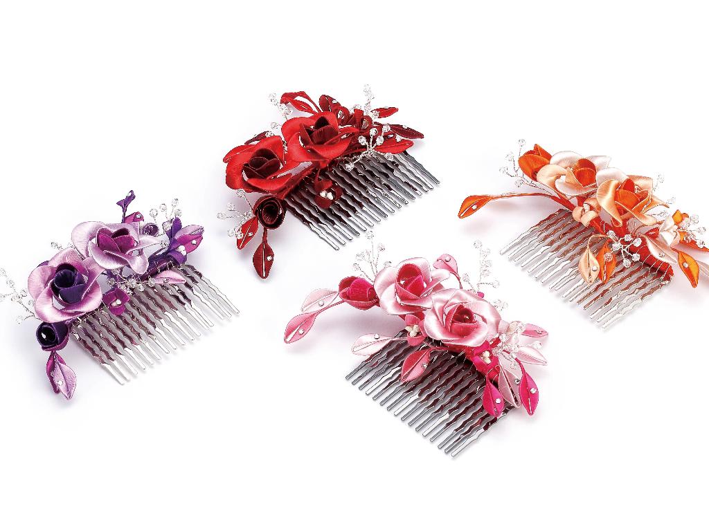 除了佛像與佛具,俗稱春仔花的纏花是另一門奠基於民俗信仰與婚喪喜慶的工藝。對來自雲林虎尾的林佩瑩來說,這也是一門引領創作者心靈成長與安定的藝術。她認為纏花運用於信仰與宮廟系統時,大多是無償奉獻的功德,若只依靠宮廟或民俗傳統的需求,勢必難以生存與傳承。因此,她決定從教學來著手。初學者的纏花練習必須依賴模版進行,需投注極大耐心,考驗著個人的細膩程度,但在技術的學習之外,林佩瑩認為思考自己投入這門技藝的期待為何更是重要,當享受其中,才能建立自己的認知與風格。她的學員先是透過反覆的纏繞動作,安定了躁動的情緒也和緩了生活的節 奏,再持續累積手藝與經驗,經由她的引導開發與創造出屬於自己的特色,以獲得青睞與客制訂單。纏花是一門創作彈性極高的工藝,許多年輕人學習後會靈活地與不同媒材做混搭,她非常樂見這樣的發展與融合。她也以身作則,不斷地突破既有印象、開發商品,例如創作男性專用的波洛領結,突破纏花多是女性裝飾品的印象;將纏花融入錫雕、剪絨、串珠、金屬編織、繩結等媒材;甚至運用於文具或生活用品,諸如以纏花點綴的文昌筆等,不僅融合傳統文化的概念,也增添文創品的特色風貌。