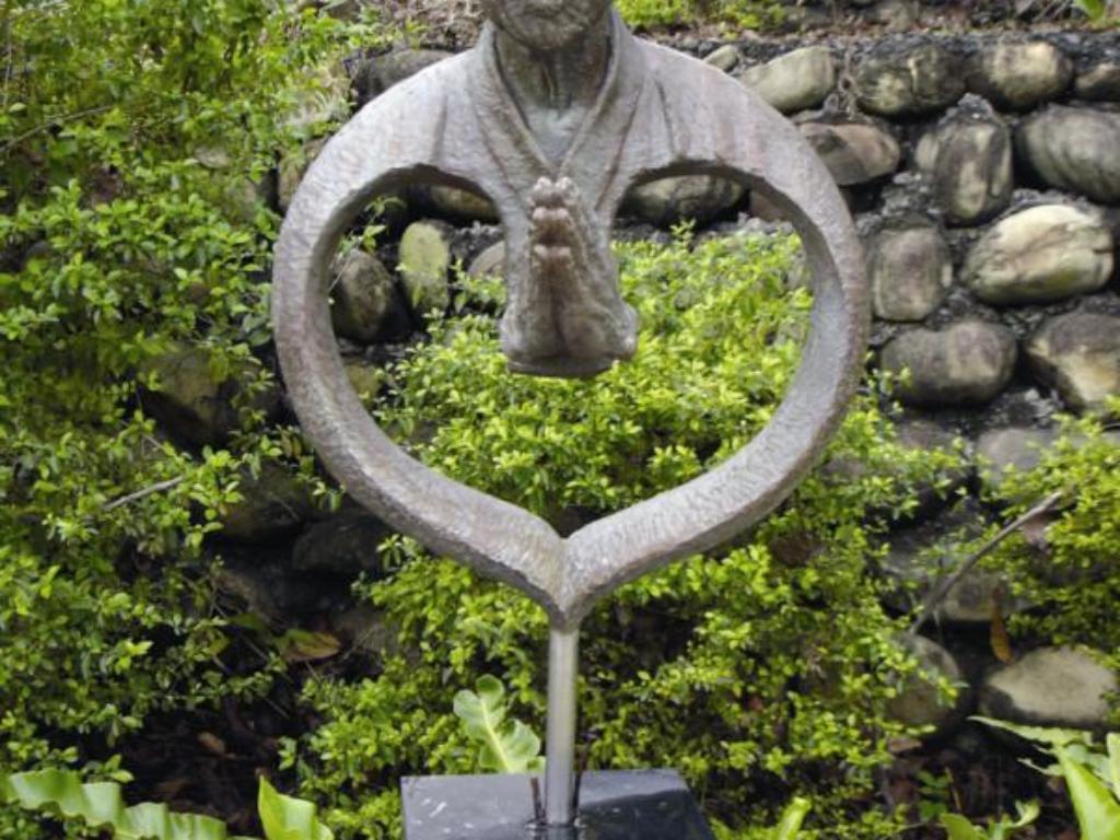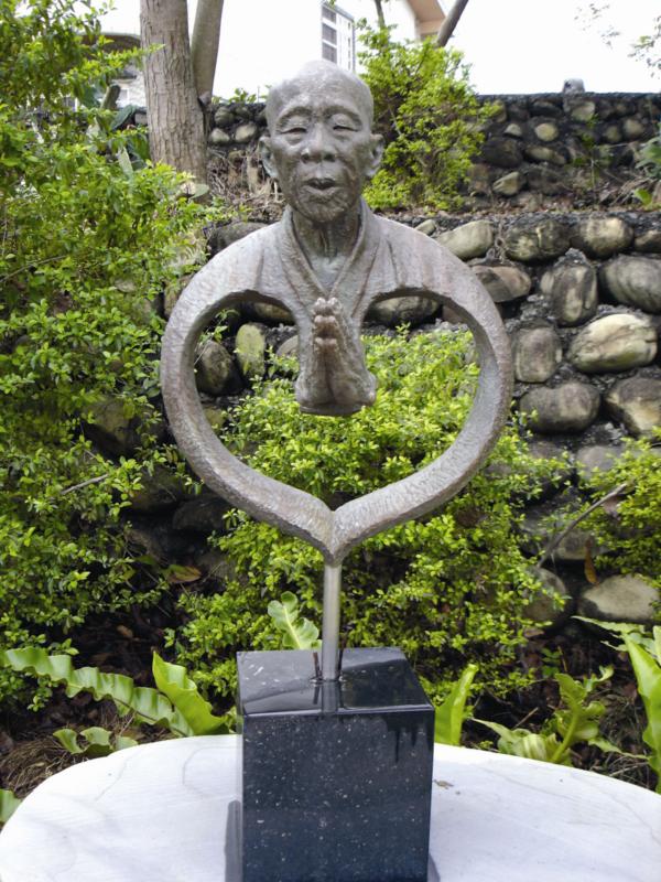 王松冠與位於名間鄉的妙明精舍住持——明忠師父是好朋友,王松冠表示,明忠師父出家前當過記者、中醫師和生意人,他老人家最常掛在嘴邊的是:最富有的人才給得起;雙掌合十在心口,用心祝福別人,就可以把自己的心打開,增長智慧,也會放大慈悲心……。因此,王冠松特別以明忠師父之像塑造了一尊〈慈悲心〉。作品中的明忠師父雙掌合十,縷空的心表示其寬闊的慈悲心量,從塑像清瘦的臉部表情,我們可以看到修行者的慈眉善目!