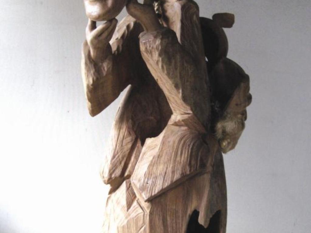 因具有攝影的經驗,對於人體相貌的輪廓、比例遠勝一般人敏銳,三天後他完成了第一件石雕作品——達摩。「我記得賣給朋友六萬元,朋友轉手賣了六十四萬元……。」此後,他每三天交一件石刻作品給朋友,時間長達二、三年。最後因為石雕過度用力容易損傷筋骨,同時會吸入大量的石灰,因此,他轉向木雕創作。