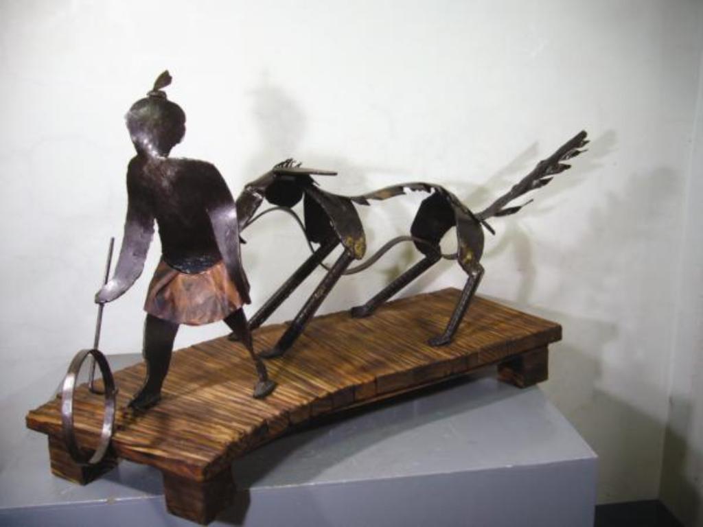 化腐朽為神奇是曾定榆的本事!他以廢棄的木箱與銅、鐵,勾勒出一幅快樂的〈童年〉時光。小孩以竹棒勾著圈滾著玩,這是「古早時」的玩具。狗兒是鄉下孩子的「隨滬」,無論主人走到那兒,牠總是不離不棄!看到小主人快跌跤了,牠護主心切,緊咬著衣襟,整個畫面令人望之不覺莞爾。