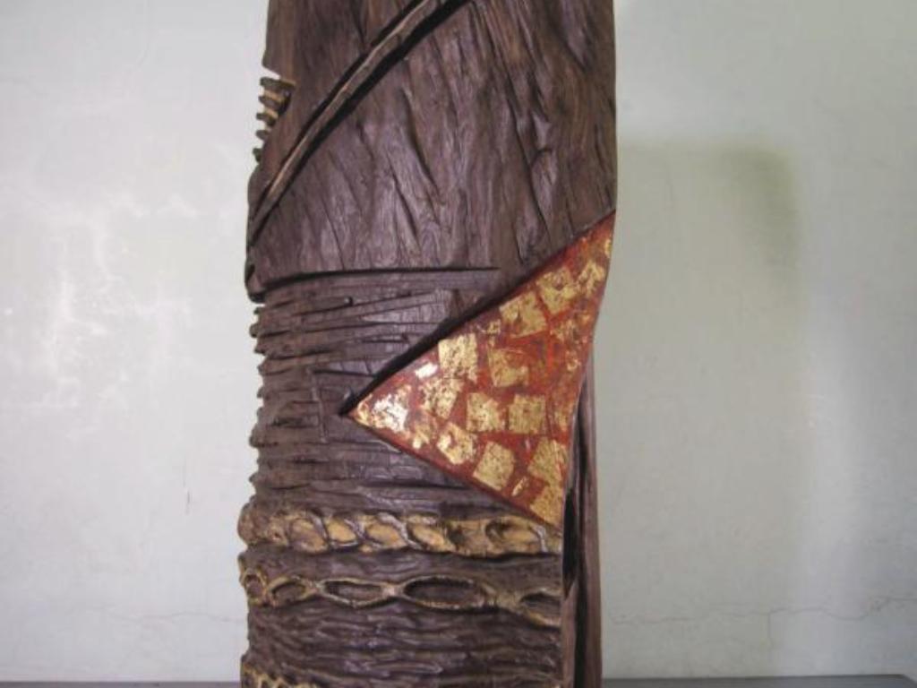 〈古老的記憶〉是曾定榆,某日發現一節埋在地裡的樟木,順著木頭自然的紋理,以「結繩記事」和「契刻記事」刻畫出的作品。此作樸實古雅,含蓄呈現與天地共榮的遙遠歲月。