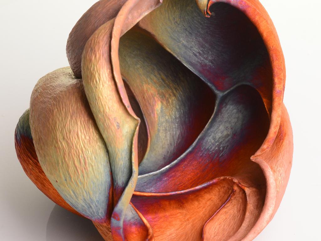 透過平坦的金屬媒材,開始創作造形到立體蜿蜒,將創作時候律動的肢體與心意合而為一。在每個鍛敲過程中,透過形而下、身體勞動的創作過程完成作品,再經由作品的呈現,傳達形而上、精神層次的心靈感受。創作每一件作品,均期望能達成身心合一的融合境界,並提升工藝創作的精神層次。