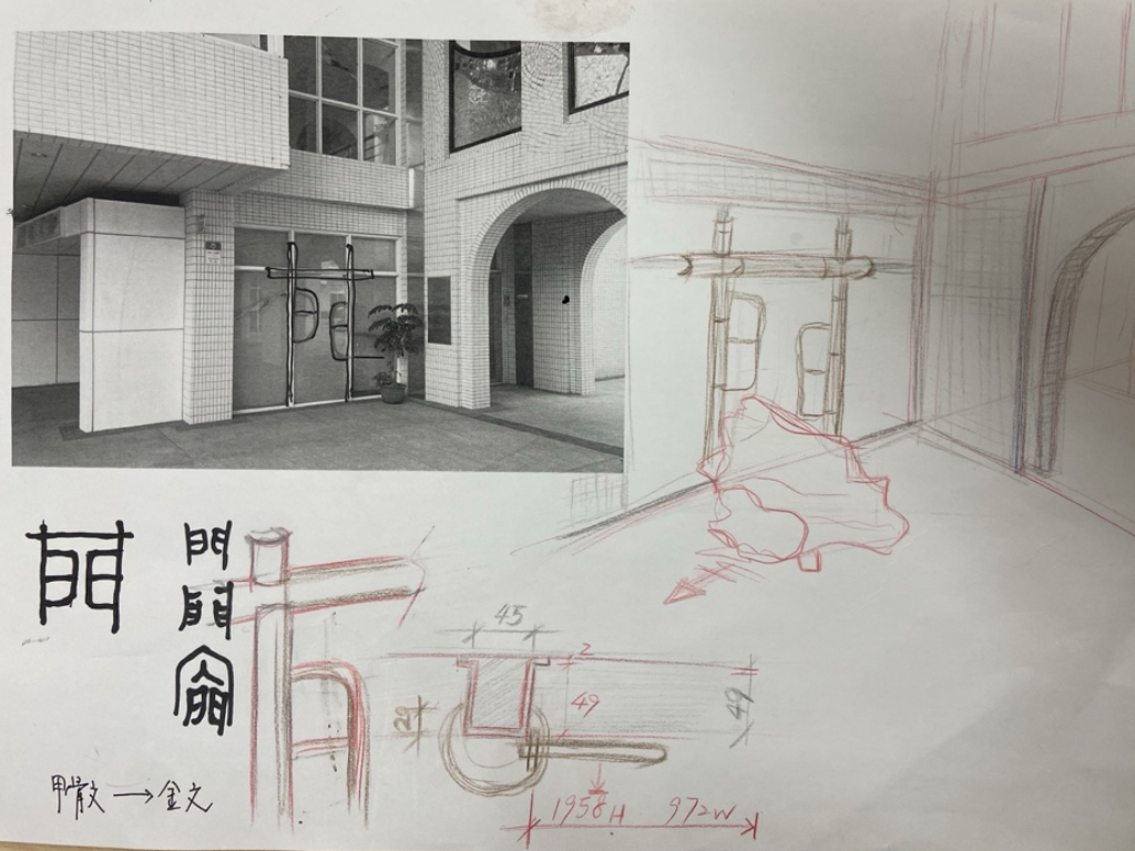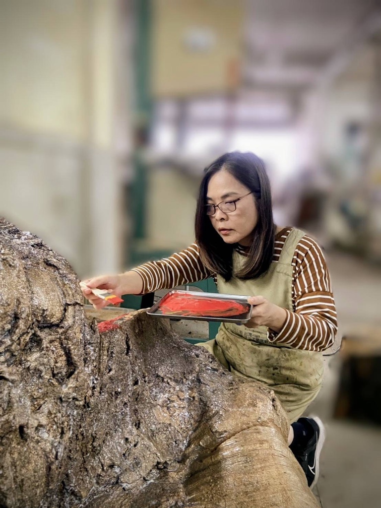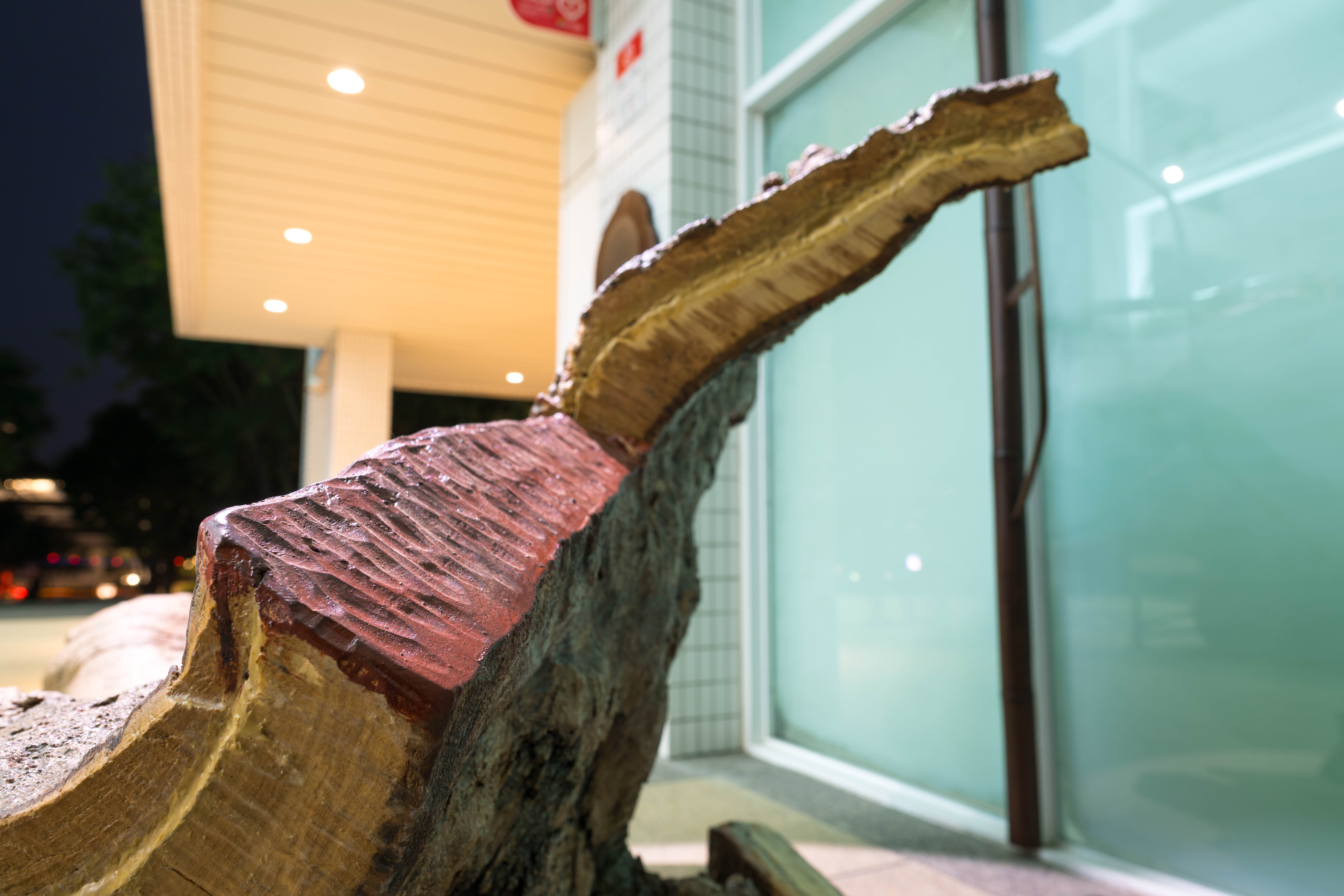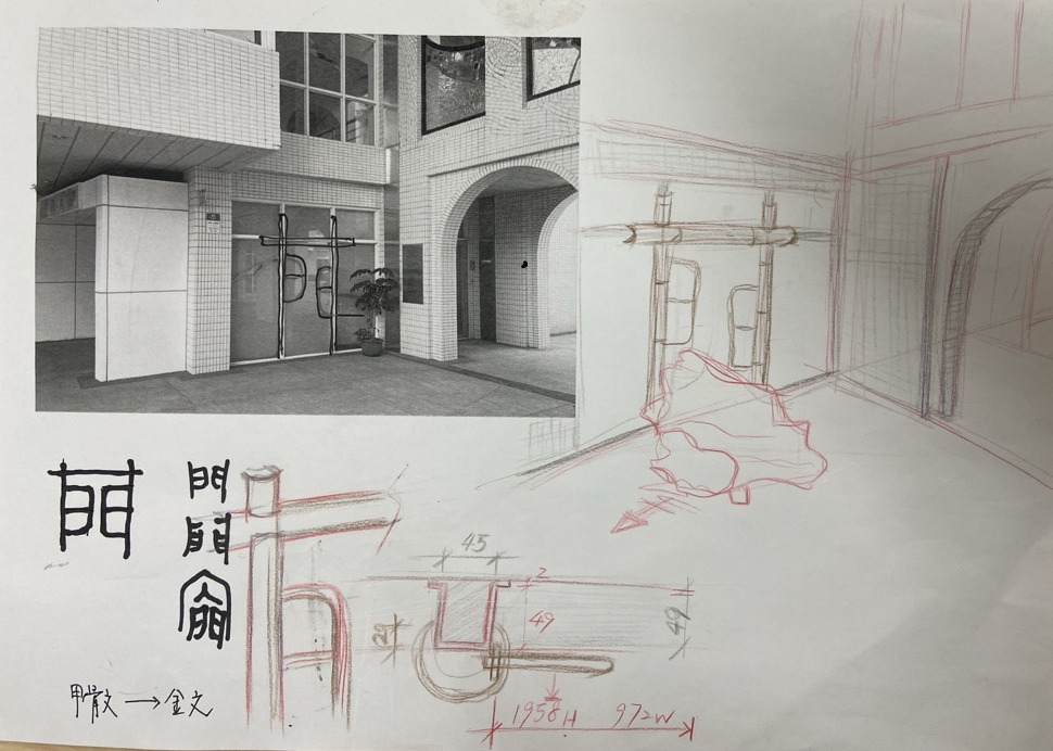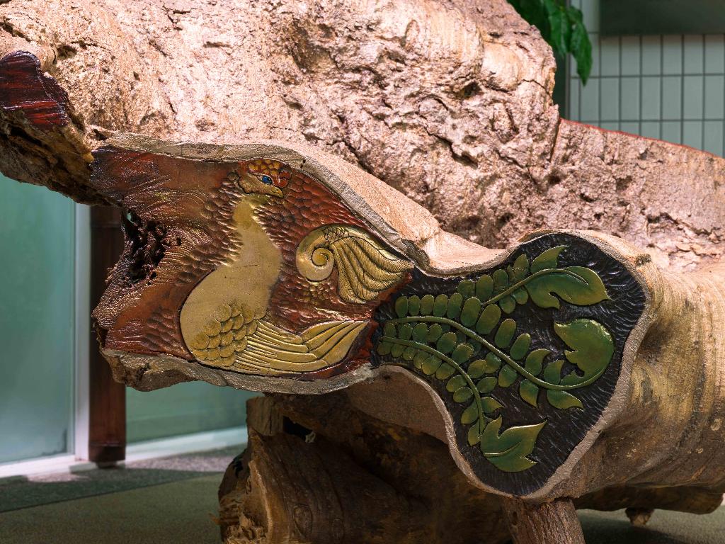 《 座 鳳凰 》 《 座 鳳凰 》園區位置:行政大樓大廳座鳳凰.天人共創 自然成;鳳凰花.驪歌初動 離情依;凰樹下.工藝廊道 寫歷史。工藝年 啓藝留我初心 採用甲骨文的”門”字造型的竹藝門框,很好的作為木質與玻璃背景的過渡;「蓬萊塗」鳳凰的彩繪對應了上方的彩色玻璃,同時寓意了竹門飛出金鳳凰及浴火鳳凰的雙重美好祝願。《座 鳳凰》局部1《座 鳳凰》局部2《座 鳳凰》設計手稿尊重自然造成的裂縫,一斧一鑿,腐朽並非終點,藝匠賦予新生命鳳凰雕刻,運用蓬萊塗技法是最適合的。以生漆封存風化的痕跡、用漆彩點活鳳凰的生命,蒔繪如星塵落在羽翼和葉脈之間,接受光陰流轉的一切,淬鍊之後、繼續前行鳳凰雕刻運用蓬萊塗技法是最適合的