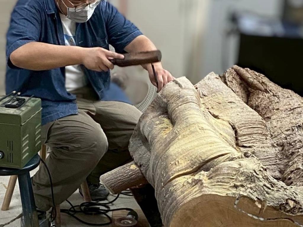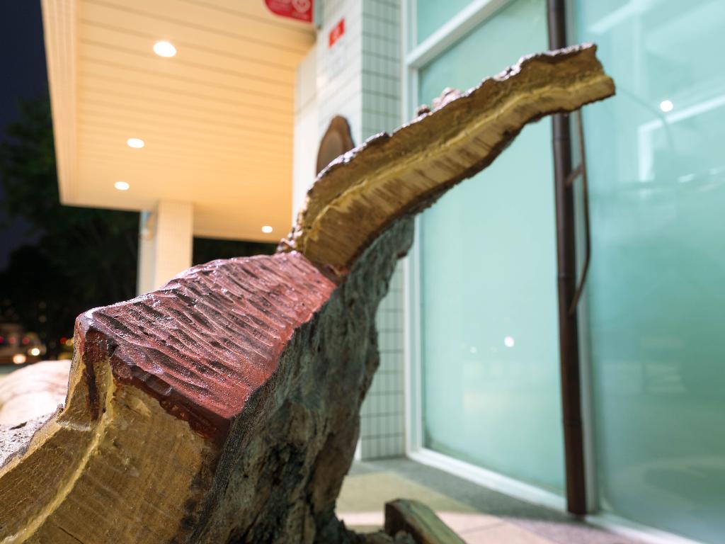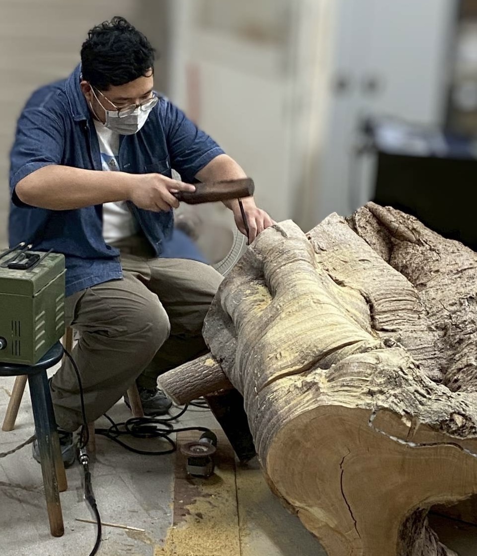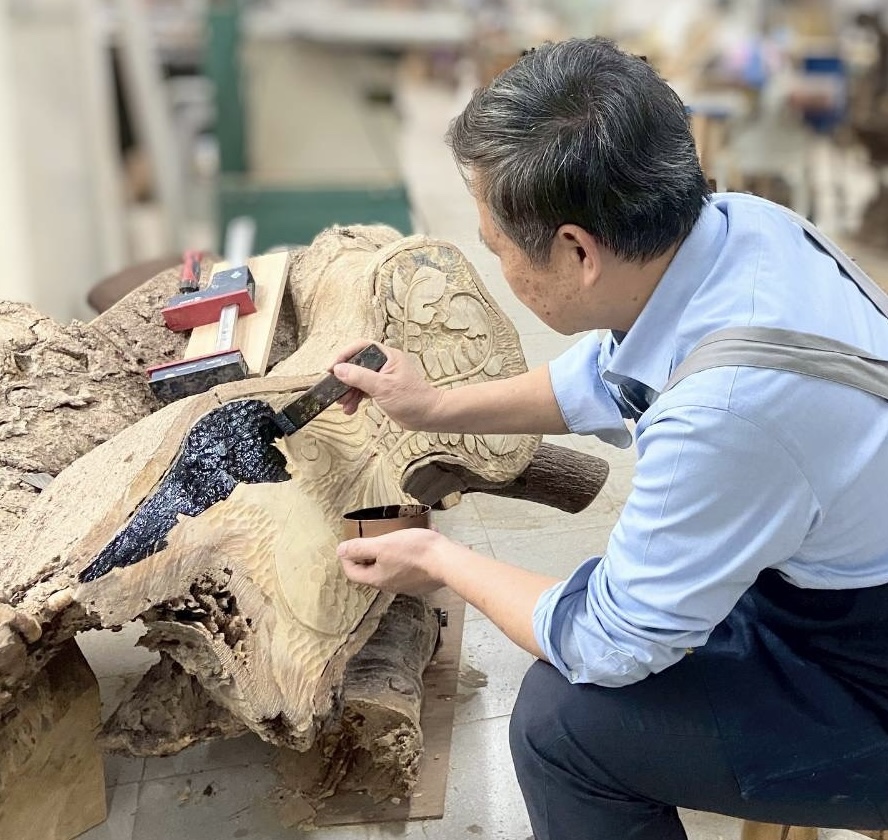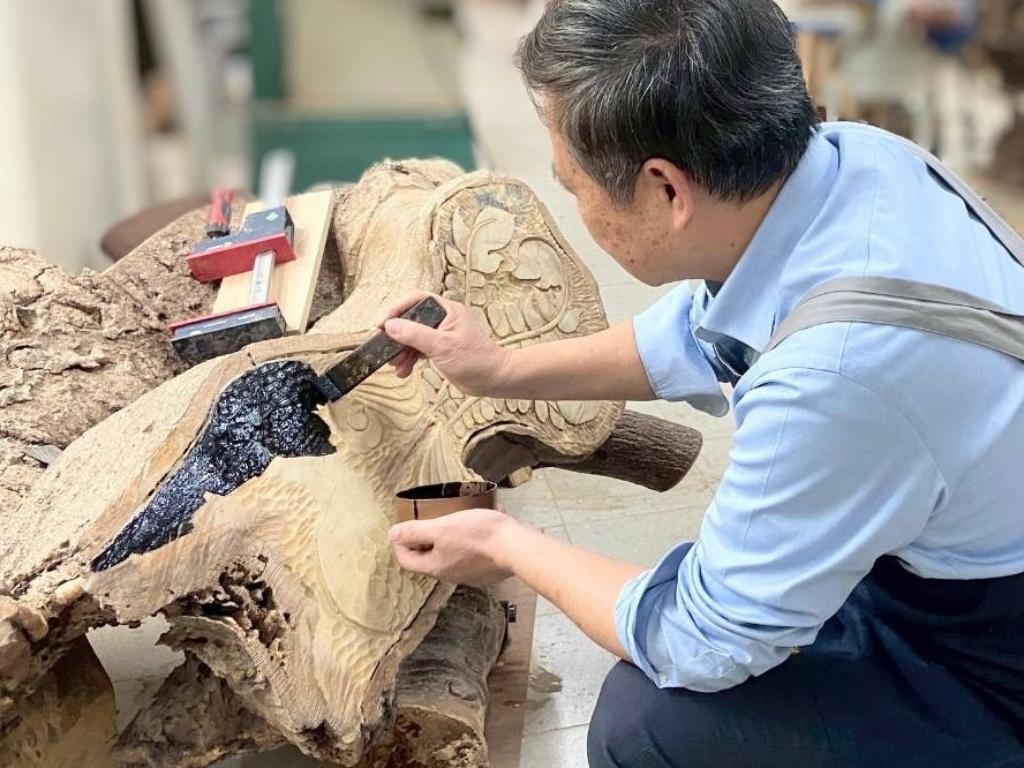 《 座 鳳凰 》 《 座 鳳凰 》園區位置:行政大樓大廳座鳳凰.天人共創 自然成;鳳凰花.驪歌初動 離情依;凰樹下.工藝廊道 寫歷史。工藝年 啓藝留我初心 採用甲骨文的”門”字造型的竹藝門框,很好的作為木質與玻璃背景的過渡;「蓬萊塗」鳳凰的彩繪對應了上方的彩色玻璃,同時寓意了竹門飛出金鳳凰及浴火鳳凰的雙重美好祝願。《座 鳳凰》局部1《座 鳳凰》局部2《座 鳳凰》設計手稿尊重自然造成的裂縫,一斧一鑿,腐朽並非終點,藝匠賦予新生命鳳凰雕刻,運用蓬萊塗技法是最適合的。以生漆封存風化的痕跡、用漆彩點活鳳凰的生命,蒔繪如星塵落在羽翼和葉脈之間,接受光陰流轉的一切,淬鍊之後、繼續前行鳳凰雕刻運用蓬萊塗技法是最適合的