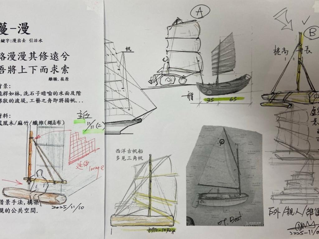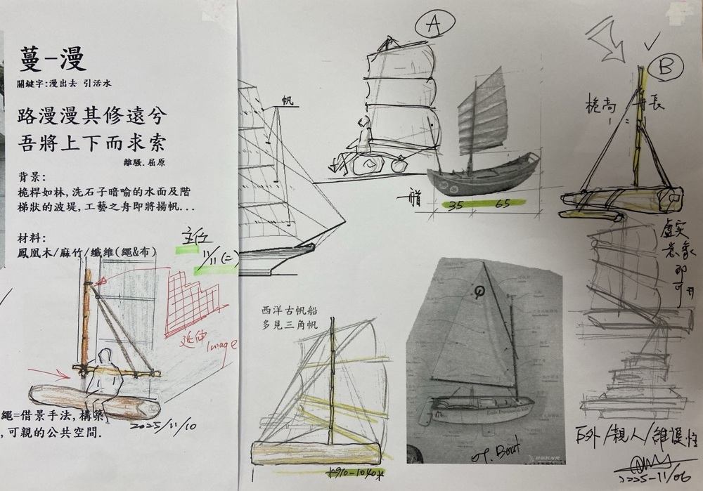 《 舟 鳳凰》 《 舟 鳳凰 》園區位置:生活工藝館1樓大廳鳳之舟.天創地設 造化成;凰來儀.朝陽光芒 蔓宇內;樹標竿.工藝遠航 漫活水。工藝之舟 藝啟十方 桅杆與竹編融合建築物的外立面借景手法,使整個建築物化做整片船帆,象徵工藝之舟即將遠航,藝啟十方,我們期待工藝遠航將工藝精神漫出去,引來活水。工藝之舟即將遠航藝啟十方經緯之間編織的是遠航起帆的夢想,也是匠心的堅持《舟 鳳凰》設計手稿《 舟 鳳凰》作品夜間燈飾