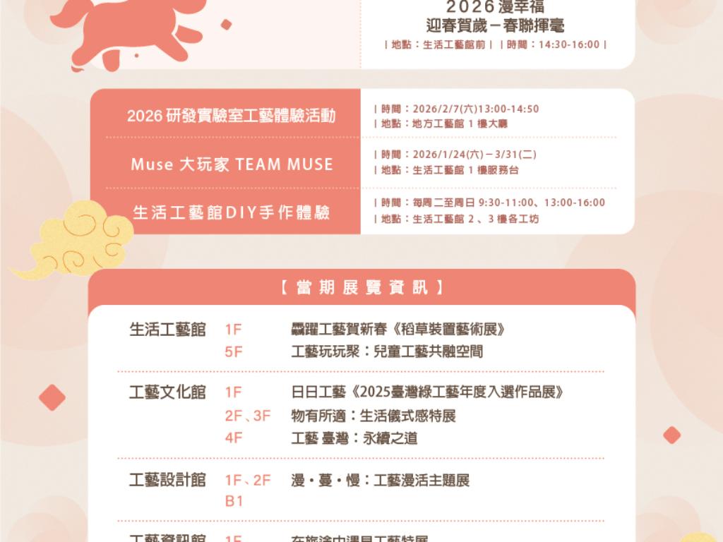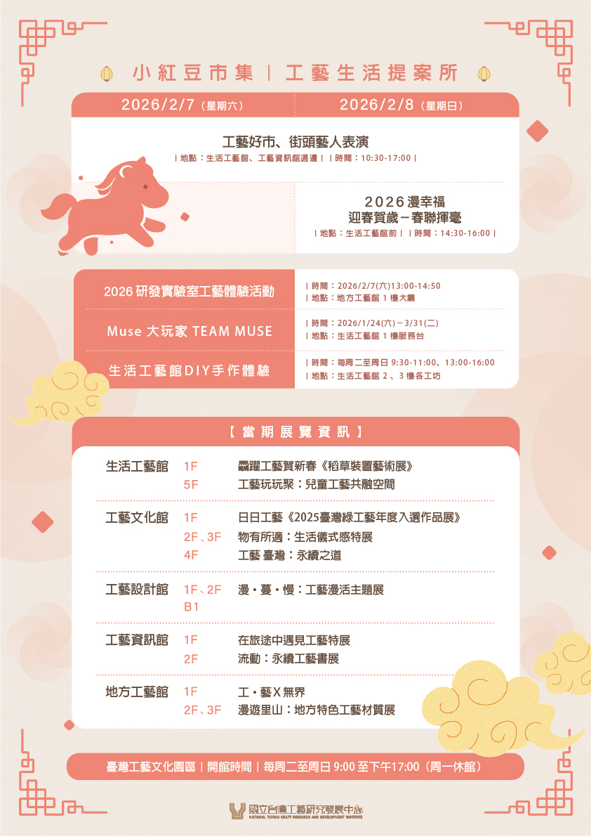 2026農曆春節特別策劃「攏馬有春」系列活動,集結了小紅豆市集|工藝生活提案所的工藝好市、街頭表演、工藝咖啡/茶席、工藝開講等活動外,春節期間再加碼限定 —— 明信片集章、多樣手作DIY體驗、VR360沉浸式體驗,邀請您在新春假期走進園區,用工藝陪你過好年,感受滿滿節慶氛圍,迎接一整年的好運氣!