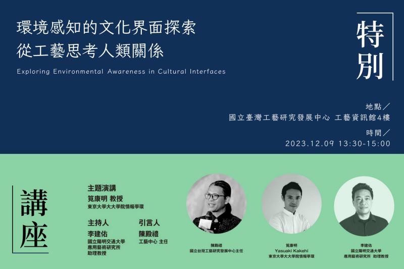「環境感知的文化界面探索_從工藝思考人類關係」特別講座 「環境感知的文化界面探索_從工藝思考人類關係」特別講座工藝科技融合人文,探索臺灣未來工藝#12月9日#即日起報名講座主講特別邀請日本筧康明教授近距離與臺灣來自各領域的創作者、藝術家和研究者進行深入的交流探討當代人類科技碰撞傳統工藝文化的重要議題,並致力於探索臺灣未來工藝的發展前景。透過深入瞭解與探討如何在科技的引言下,將臺灣工藝的文化與語言帶進世界的舞台,鋪陳臺灣的工藝產業更具前瞻性和永續性的發展基石。最終期待這場講座成為刺激更多跨領域合作的契機,共同打造一個豐富而具活力的工藝生態系統,歡迎有興趣者報名參與!「環境感知的文化界面探索」講座 活動日期|𝟐𝟎𝟐𝟑.𝟏𝟐.𝟎𝟗 𝐒𝐚𝐭.活動時間|𝟏𝟑:𝟑𝟎-𝟏𝟓:𝟎𝟎活動地點|國立臺灣工藝研究發展中心(工藝資訊館4F國際會議廳)報名網址|https://reurl.cc/Xm0eWe關鍵字工藝焦點