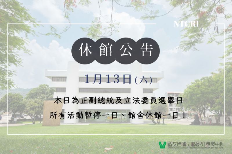 ※1月13日(六)工藝中心休館公告※ 【1月13日(六)工藝中心休館公告】⠀適逢正副總統及立法委員選舉投票日,臺灣工藝文化園區所有活動暫停一日,所有館舍皆休館一日!國立臺灣工藝研究發展中心敬上關鍵字工藝焦點