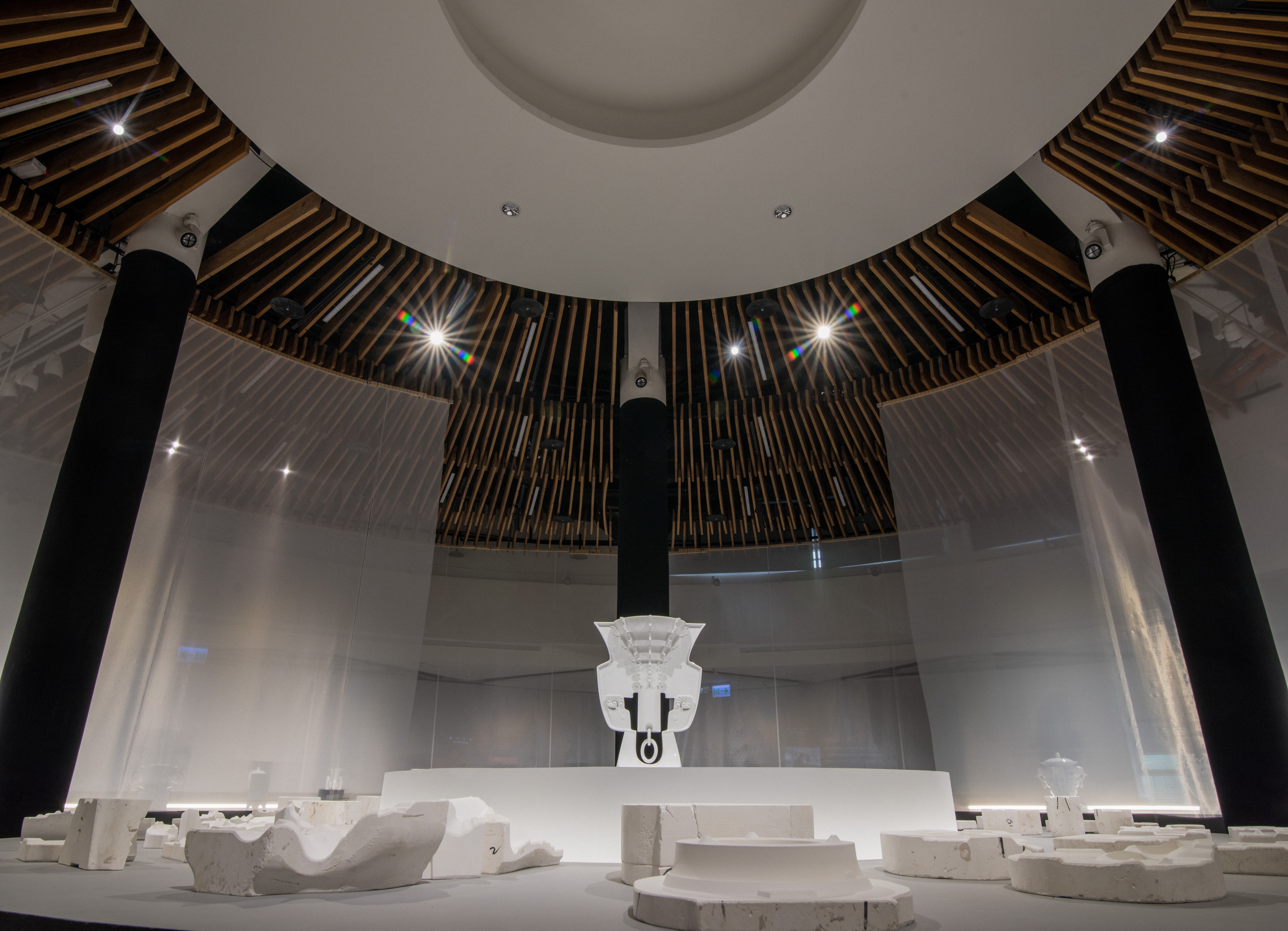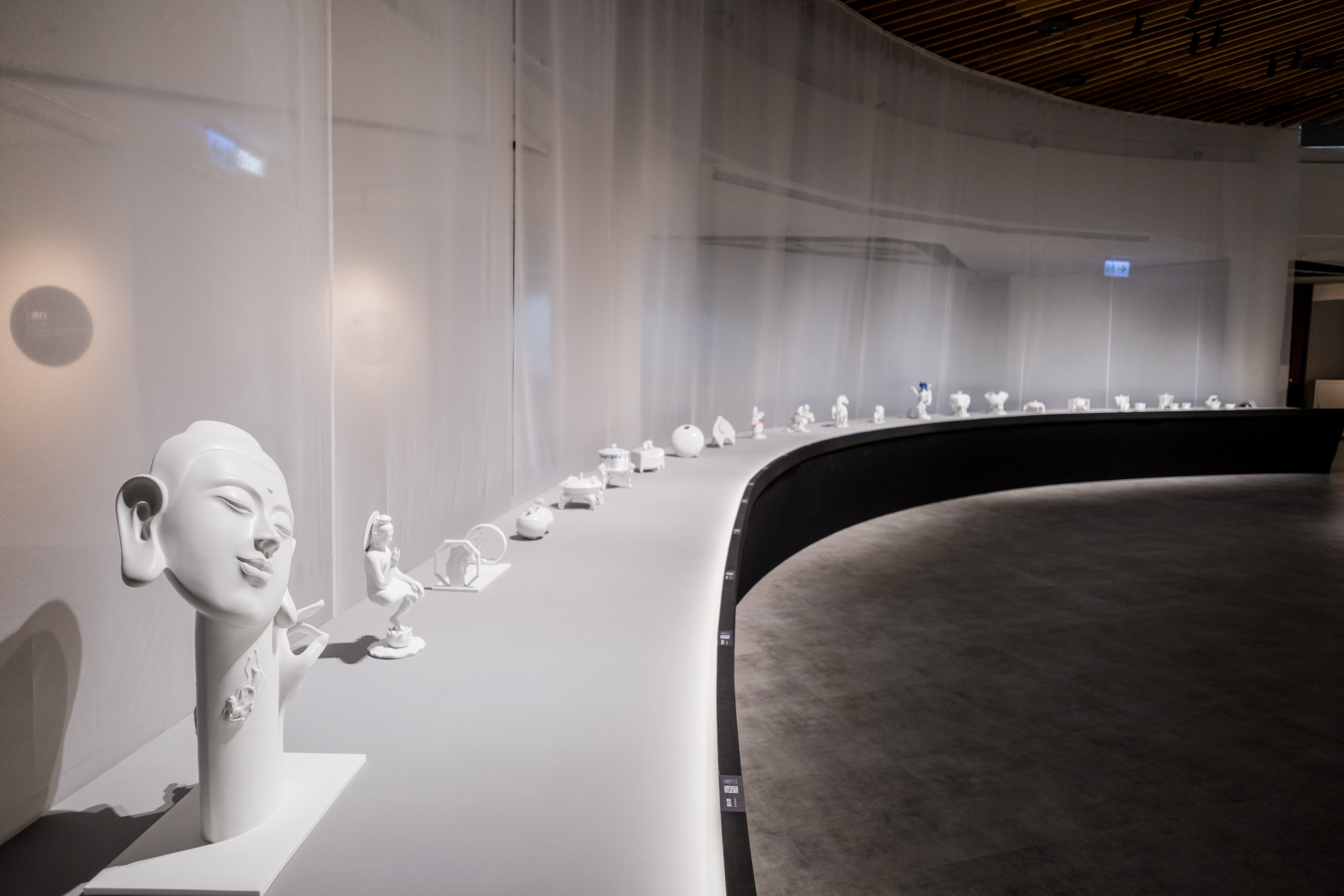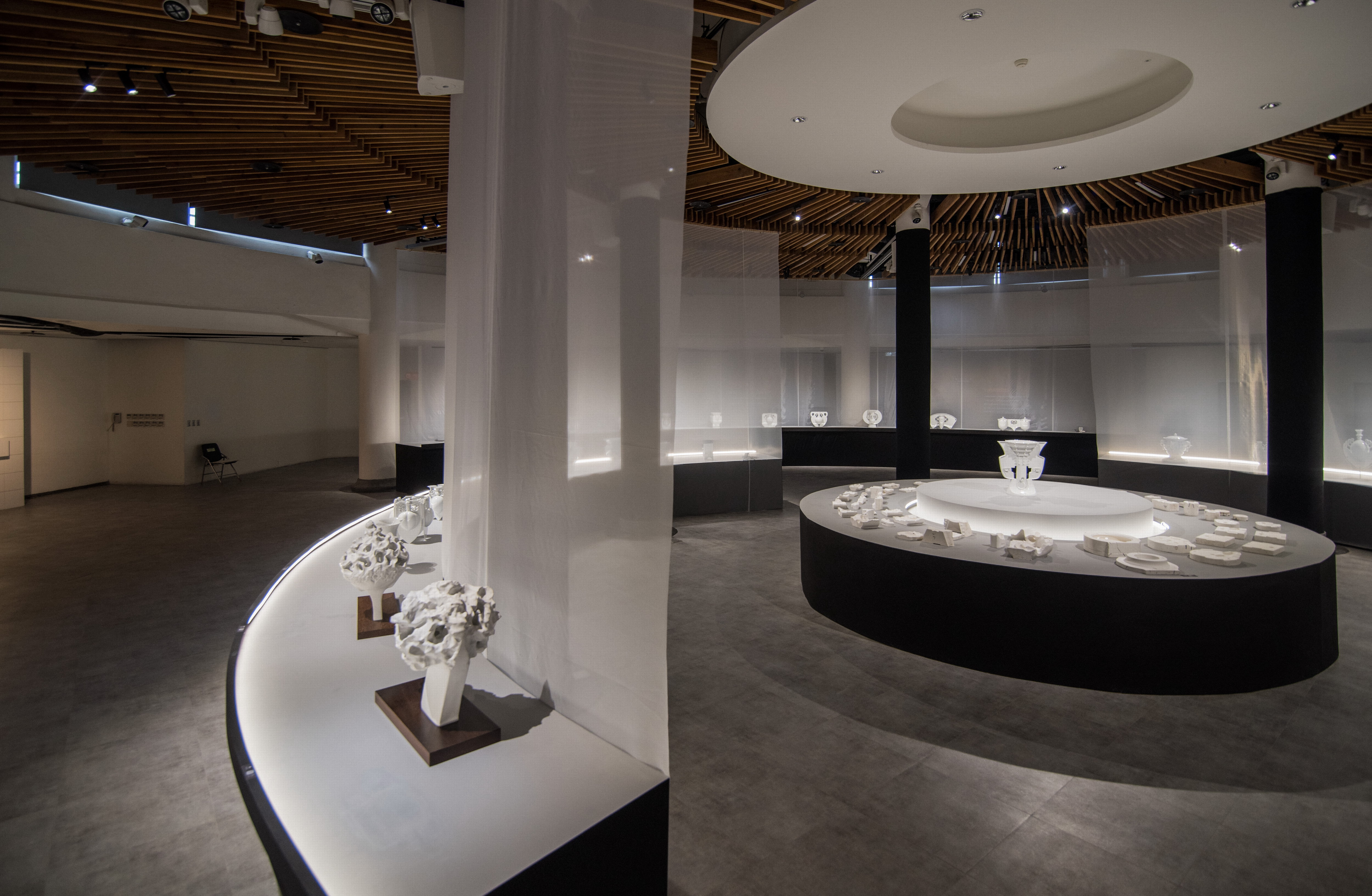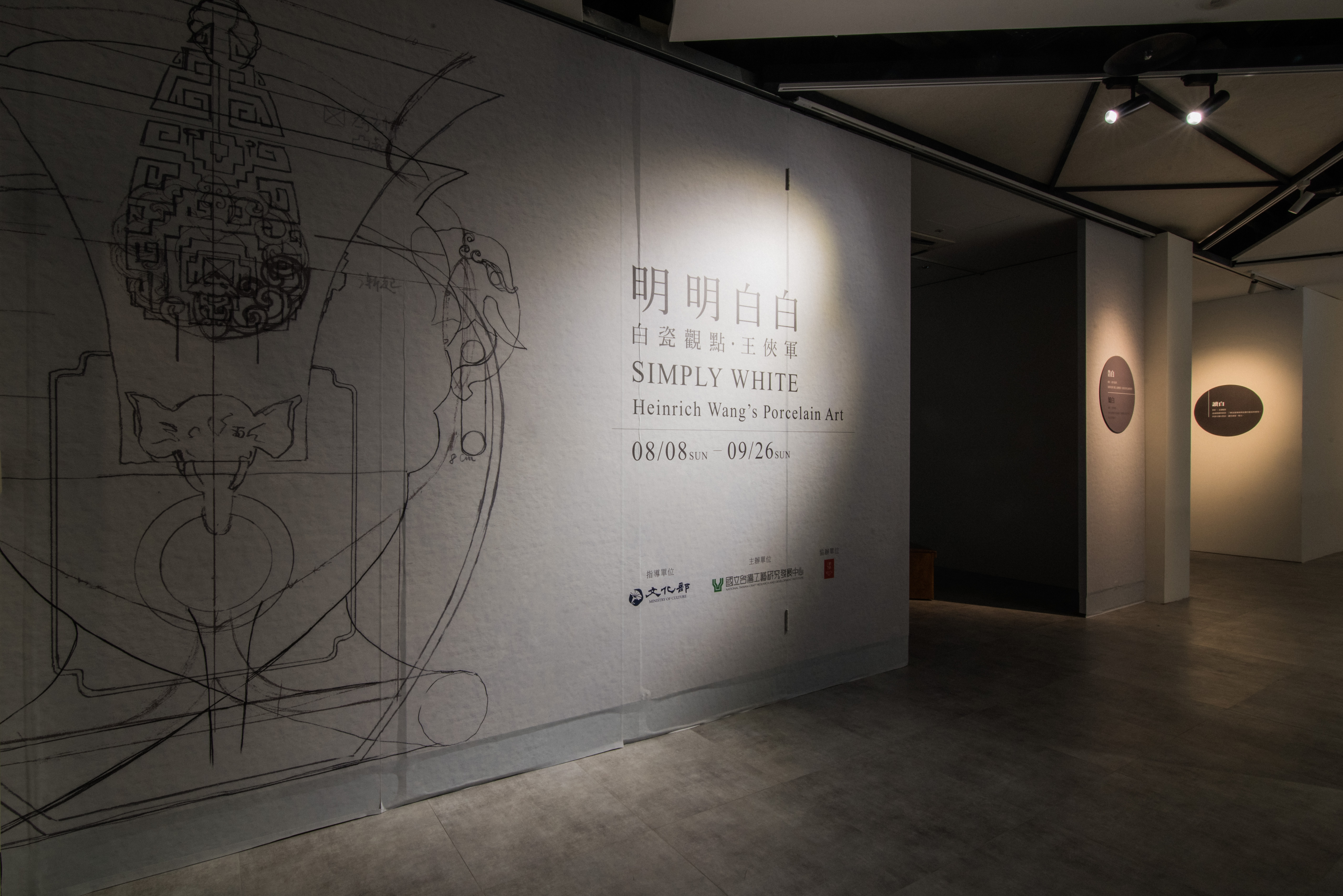 本次展覽展場空間,以東方園林動線『一阻、二引、三通』取徑通幽的漫遊氛圍。『一阻』,隔著紗網讓心境沉澱下來。『二引』透過環行走廊,慢慢地瀏覽作品。『三通』進到核心解密中央展區,由紗網圍繞的核心區豁然開朗。搭配空間巧妙安排「人文」、「工藝」、「科技」三個面向,探索工藝創作的多元發展,彷彿回溯白瓷所承載著的生命歷程記憶及創新思維:以「告白」解密創作者故事,敘事其從事工藝之心路歷程及作品特質。藉由「知白」解構創作者發想歷程及開發生產過程及技術創新,突破傳統工藝之材料、技法之思維。同時融合科技以「留白」呈現工藝與科技互動展演,透過多媒體影像表現白瓷與光影之虛實呼應。最後的「讀白」透過閱讀探索瓷器脈絡,了解瓷器發展與焰變歷程,獨留參展者與書本之對話,讓我們的思緒留一點白。邀請大眾共同來品味白瓷形體之美,與展品靜靜對話,解讀明明白白所表達之意境及涵意。