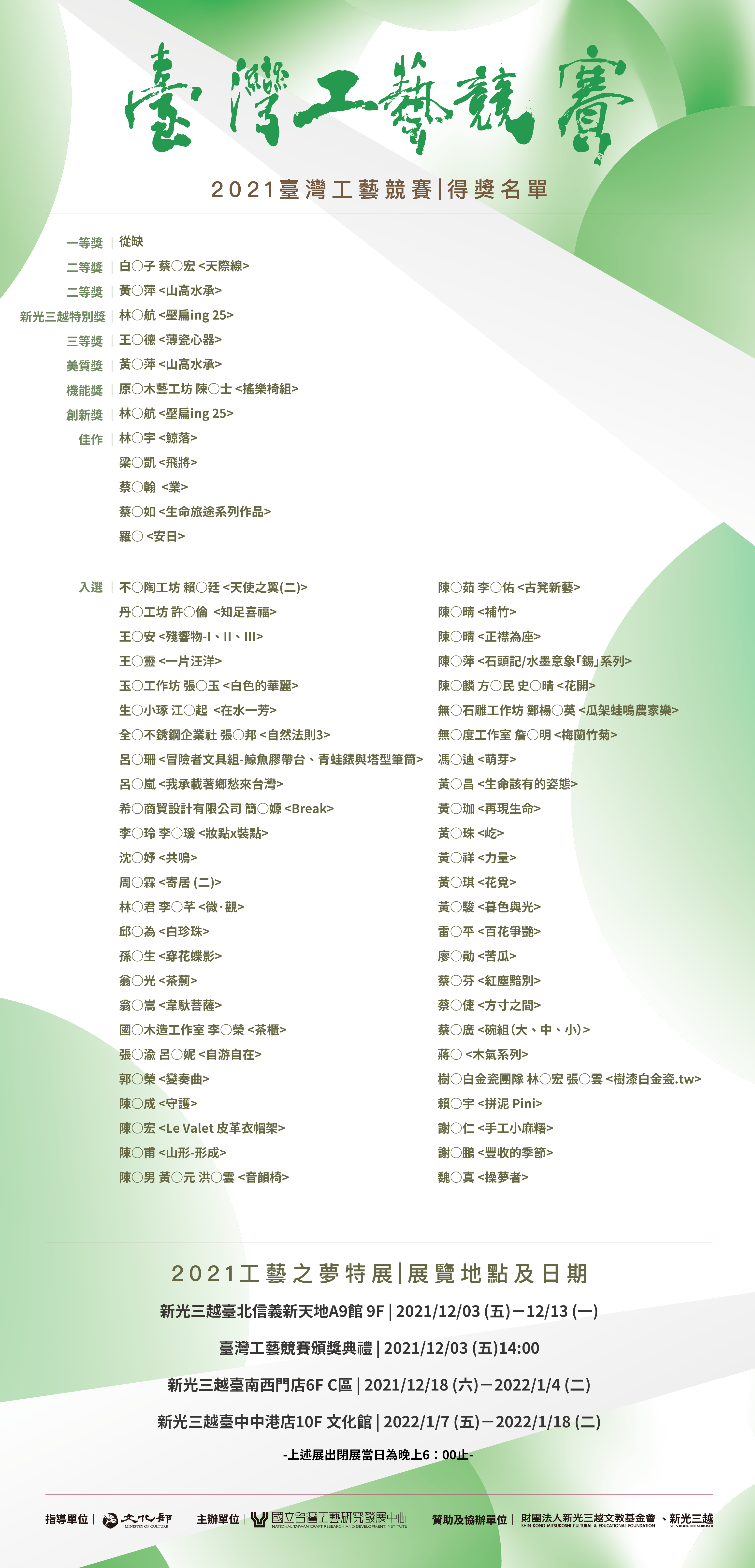 今年入選以上60組(件)作品,先行於國立臺灣工藝研究發展中心臺北當代工藝設計分館預先展出,12月移師至信義新天地新光三越展出,並於12月3日辦理頒獎典禮,之後陸續至新光三越台南西門店及台中店巡迴展出。