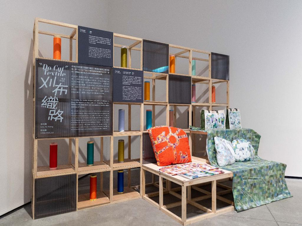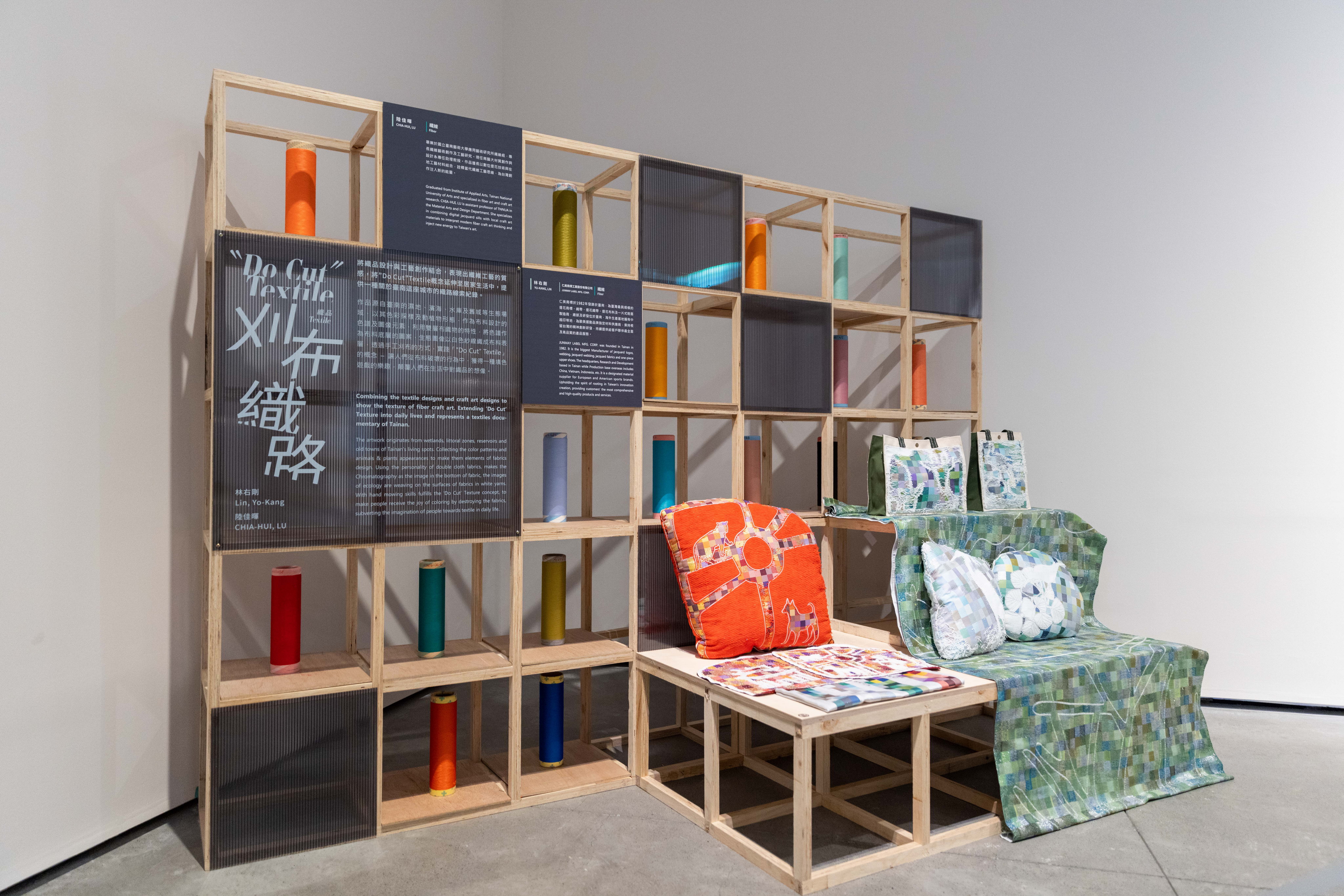 合創成果中,現居臺南官田的刀藝師徐奕承,作品《島映/倒映》是透過高熱鍛造的金屬,形塑出一座座島嶼山脈,製成映照自身的鏡子,而串連一座座島嶼山脈則是如水波、土壤般具有柔韌特質的皮革縫線,利用質地相異的材料及其特性;來自龍崎的竹藝師蔡惠婷,作品《時間線》運用竹材與皮革的特性,相互交織而出的椅子竹材與皮革的相互交織,像似承載著人與時間的記憶溫度,交織頻繁留下越多的痕跡與記憶;來自臺南藝術大學材質創作與設計系的陸佳暉老師,與仁美商標第二代老闆林右剛合創的《刈布織路〝Do Cut〞Textile》,構思源於臺南的濕地、濱海、水庫及舊城等生態場域,利用雙層布織物的特性,將色譜作為布料底層的圖案,生態圖像以白色紗線織成布料表層,透過手工刈布的方式,實踐「〝Do Cut〞Textile」的概念—讓人們從布料破壞的行為中,獲得一種填色遊戲的樂趣,顛覆人們在生活中對織品的想像,亦提供一種關於臺南這座城市的織路線索紀錄。