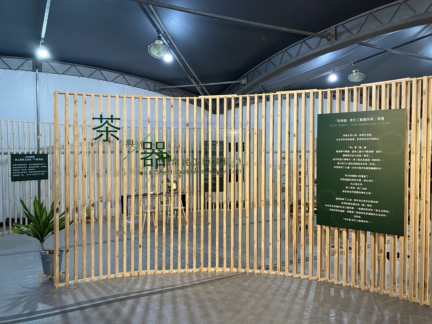 工藝中心主任張仁吉表示,從過去傳統的泡茶,走到易開罐的即飲文化,藉由本展我們期望讓兼具環境善意與當代社會價值的「器」重新回到生活中,讓喝茶不僅只是喝茶!讓人們在一杯好茶裡,能喝出台灣的豐饒風土、濃厚人情,喝出美學、品味與生活風格,喝出茶與器互動下的常民工藝關係,還有自然循環的綠工藝新主張。本次展覽從常民的茶器反應當代的社會價值:其一為生活美學,鼓勵人人學習工藝,並透過日常生活使用,傳遞工藝職人器用精神,並能發現生活中關於用與美的各種可能;其二為生活形式,訴說人與人之間因「茶與器」而建立的多種生活形式,透過享受茶飲、品味茶器,打開身體五感、放鬆身心,以茶會友,增加人際互動,為忙碌生活帶來最純粹的調劑;其三為生活哲學,在常民工藝關係學裡面,找到茶器的綠工藝新主張,發現體現於其中的「自然、循環、平衡、寬容、生命力」的本質精神,減少塑膠器物的消費使用,共同在茶周邊的生活工藝美器,一起構成飲茶的新生活風格,以手作的綠色盛器,來豐富台灣茶飲更濃醇的生活品味,在創造與使用過程中,逐步塑造台灣在地生活的哲學,追求尊重大地與永續經營的共好。