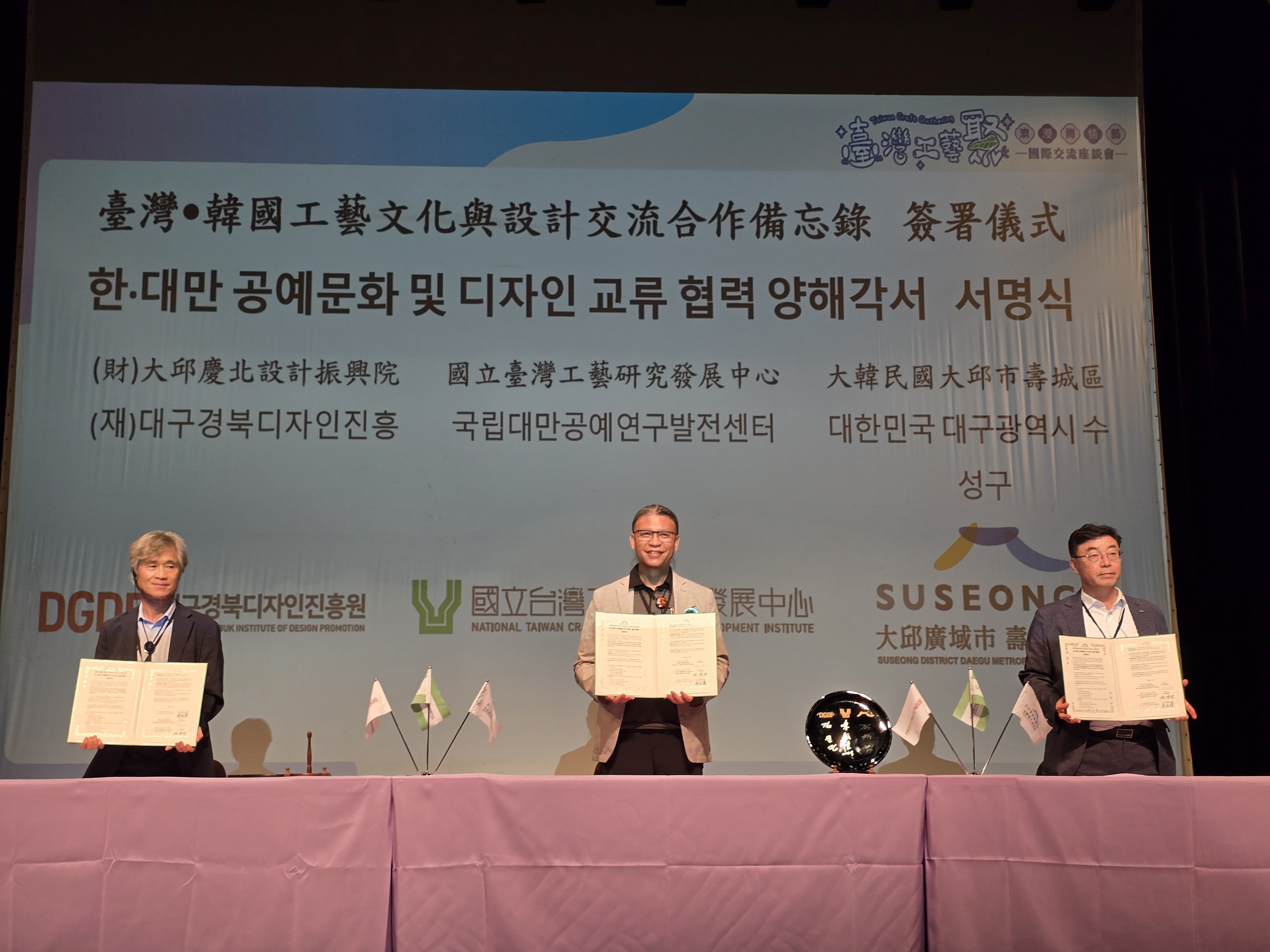 為深化國際工藝交流,強化臺韓友好合作,並推動臺灣與韓國工藝產業共榮發展,國立臺灣工藝研究發展中心(以下簡稱工藝中心)於8月29日與韓國大邱壽城區政府及慶北設計振興院正式簽署「工藝文化與設計交流合作備忘錄」,盼透過工藝、設計、技術、研究、推廣等多面向合作,建立長期夥伴關係,並開啟雙方人員互訪、知識分享與展覽交流的新篇章。